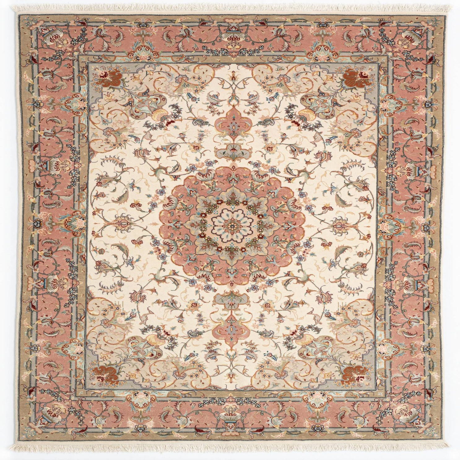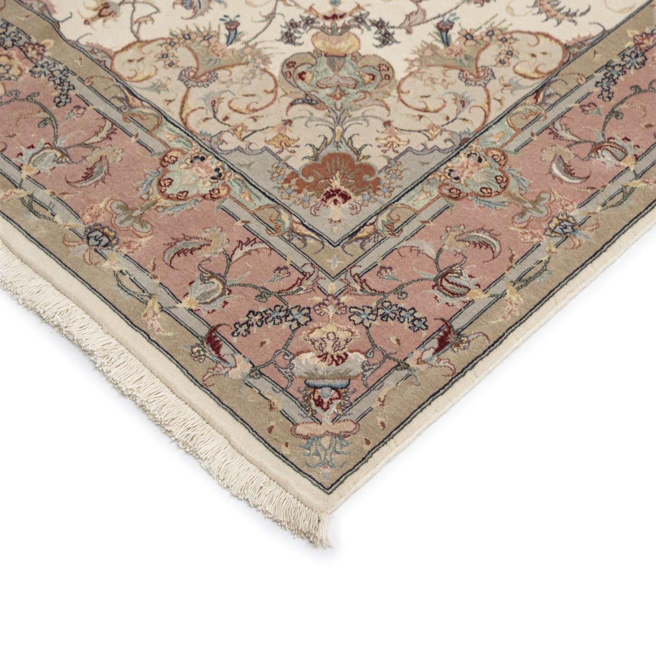 Owing to its timeless design and premium construction, this rug is especially well-suited for placement in living rooms, dining areas, or other spaces where an element of refined elegance is desired. The sophisticated pattern and color scheme of the Tabriz rug can serve as a focal point or as a complementary piece in interiors with rich wood finishes, subtle neutral tones, or spaces that incorporate antique or heirloom furniture.