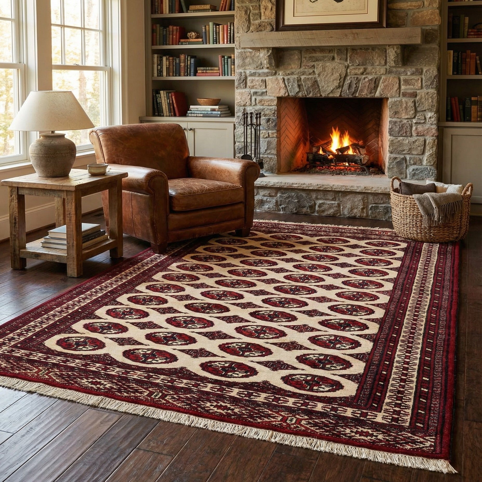 A 4x6 rectangular Torkaman wool rug featuring a traditional Persian pattern with ivory field and red, black, and blue medallions.