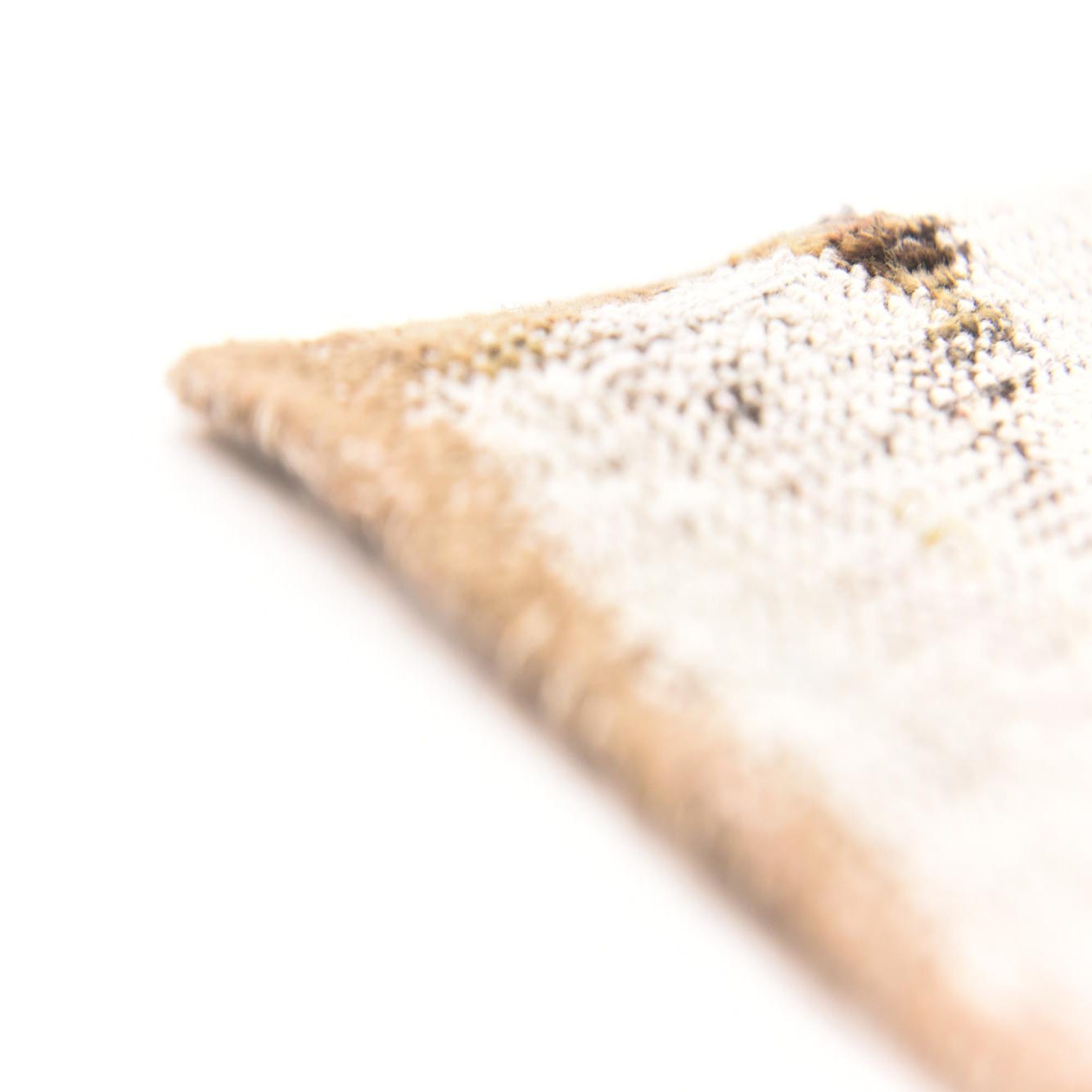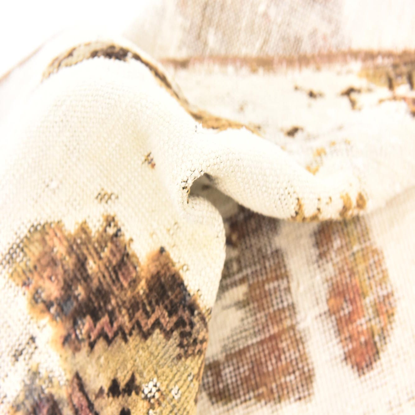 A 4x6 rectangular ivory and brown wool rug with a distressed modern abstract pattern over a traditional Persian design.