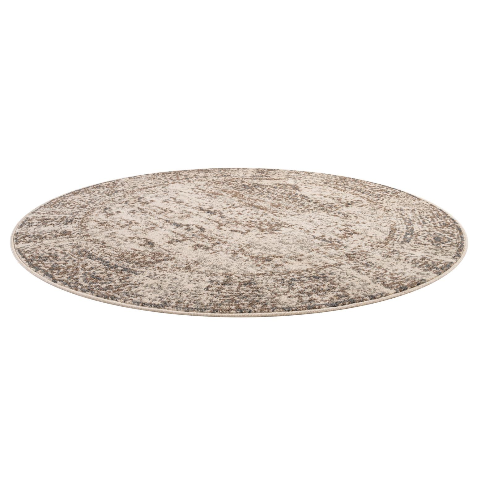 A softly worn medallion pattern gives this round rug a lived-in, layered look. Cream provides the base while mottled brown and gray form an understated, distressed motif that gently radiates from the center to a subtly defined border. The pattern balances traditional medallion elements with an abstract, timeworn finish, creating visual interest without high contrast.