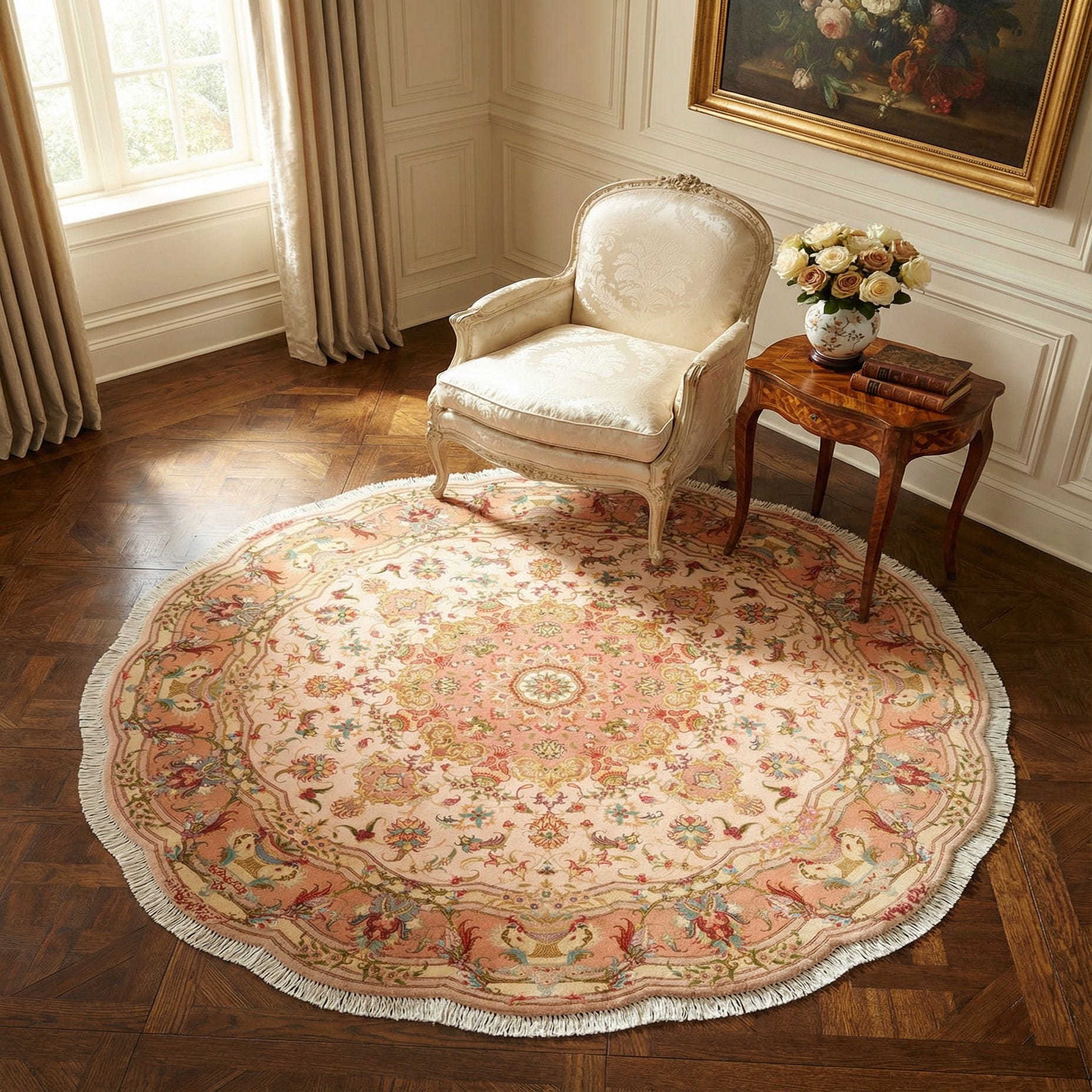 This Tabriz collection rug presents a classic Persian design meticulously handcrafted from a luxurious blend of wool and silk. It flaunts a medley of florals and intricate patterns unfolding across a cream background, with a dynamic color palette of cream, orange, purple, green, and blue bringing warmth and vibrancy to any space. The 5 ft round shape coupled with the ornate border gives this piece a sense of symmetry and elegance.