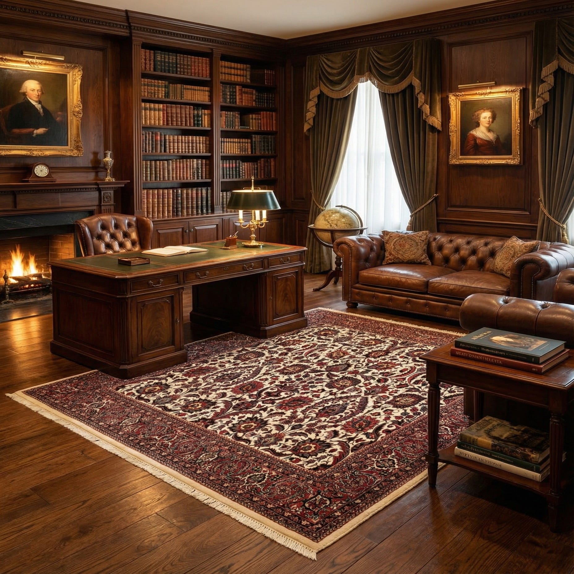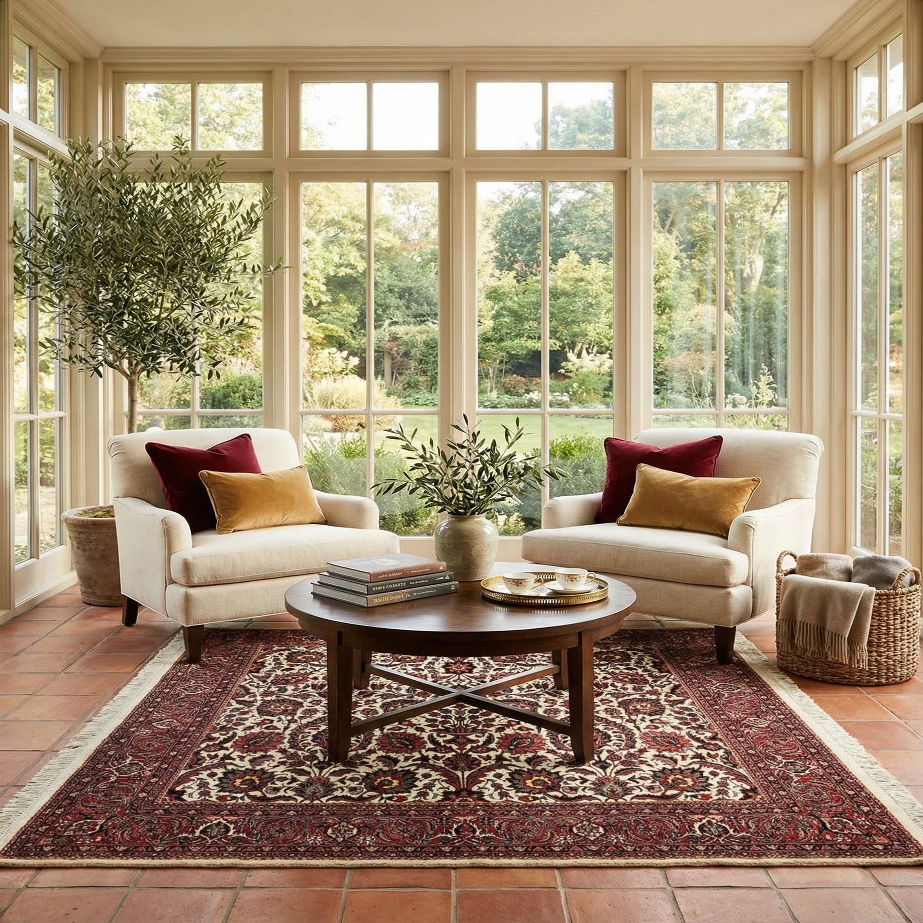 A square 4'10" x 5'6" ivory Persian wool rug with intricate red, black, and gold floral patterns and a detailed border.