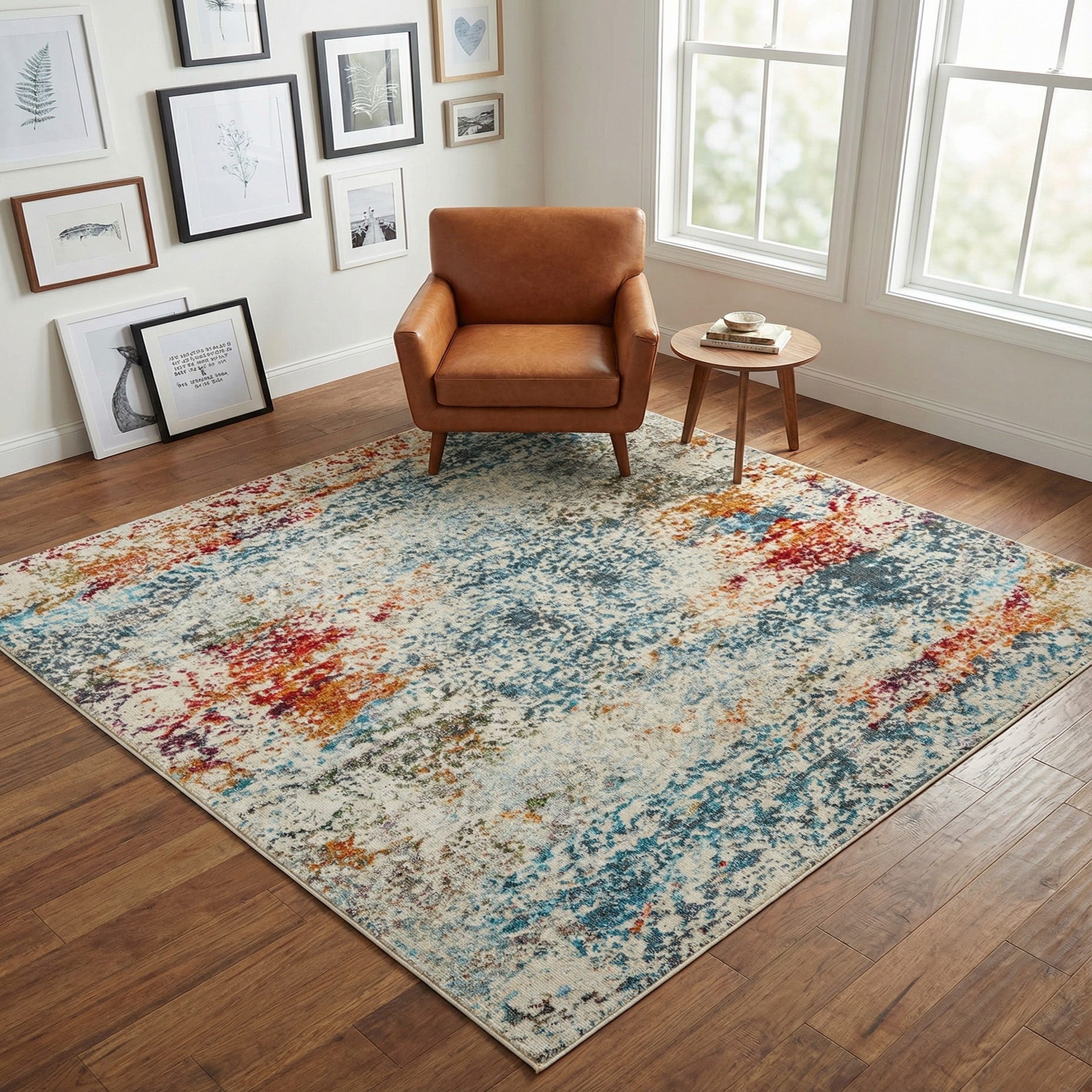 A soft cream field provides a bright, neutral base for a painterly, abstract pattern of mottled color. Areas of cool blue and warm gray sweep across the surface, punctuated by dashes of gold, orange and red that create movement without strict symmetry. The design has a layered, textured look—like fine speckling and gentle washes of pigment—that gives the rug visual depth while keeping the overall feel airy and modern.