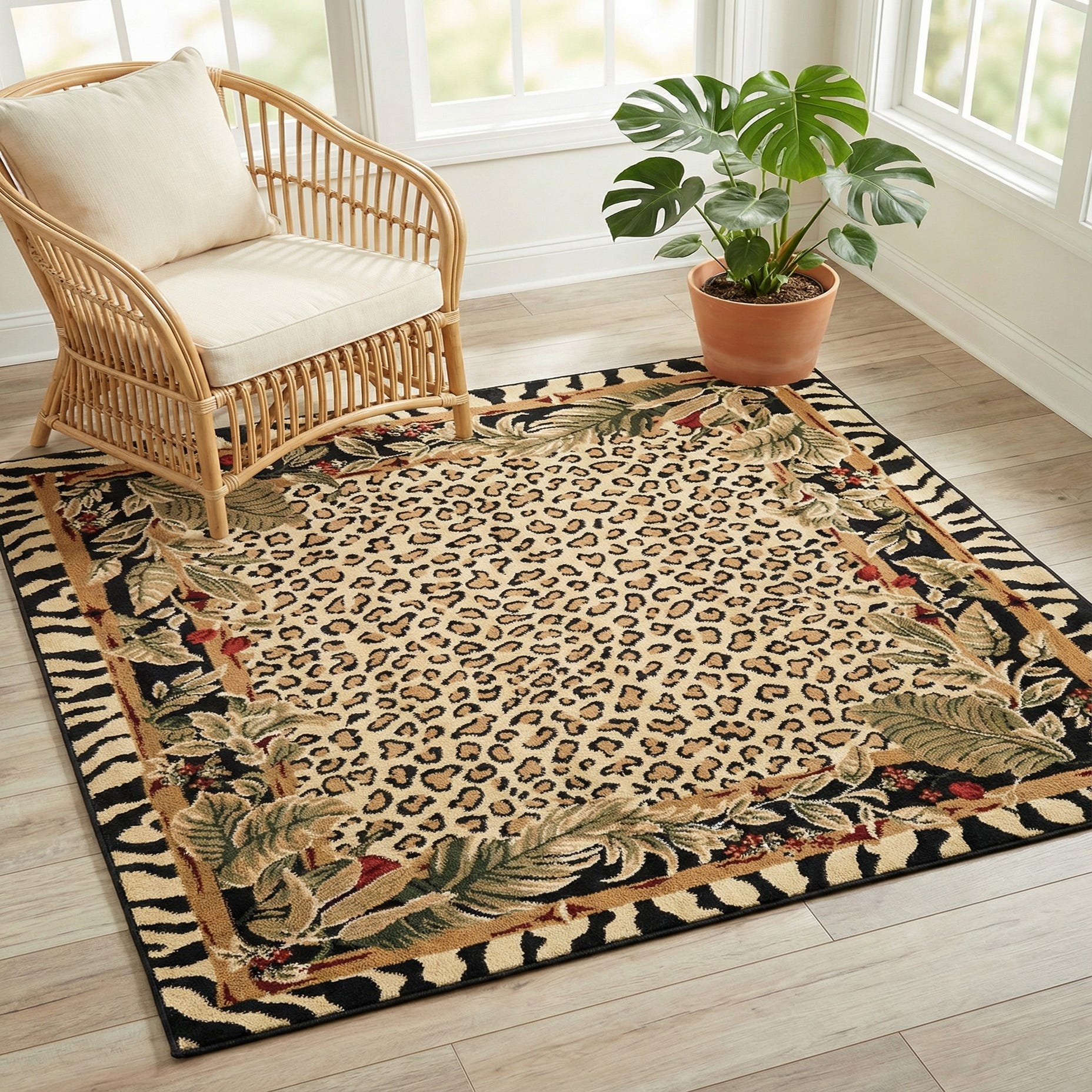 A lively mix of animal and botanical motifs gives this rug a bold, layered look. The cream field is patterned with a tight tan-and-black leopard print, framed by a narrow tan border and an inner black band detailed with olive and green leaves, burgundy and red berry accents. A zebra-stripe outer border in cream and black completes the design, while touches of ivory and tan soften the overall contrast. The design reads as both warm and energetic, with familiar natural tones set against striking monochrome accents.