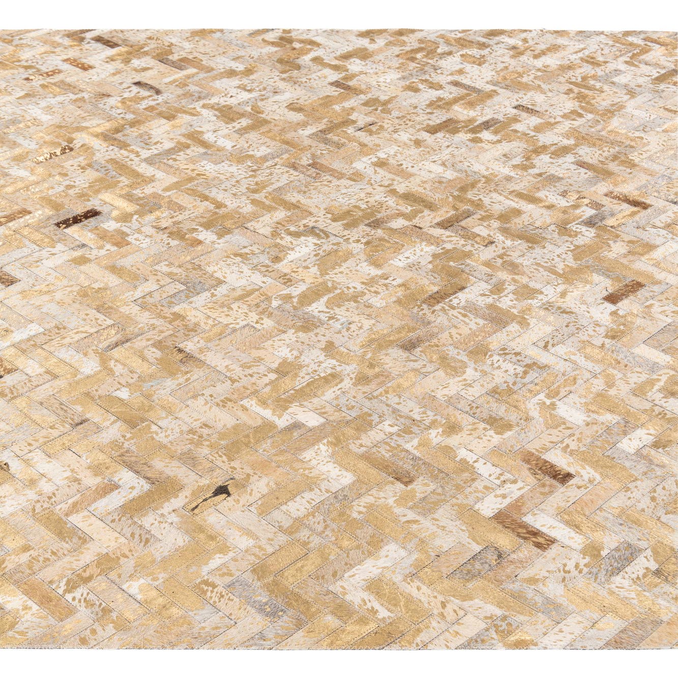 A 5x7 rectangular modern cowhide rug featuring an ivory and cream herringbone pattern with subtle brown accents.
