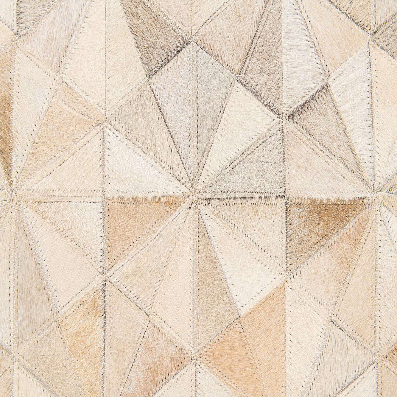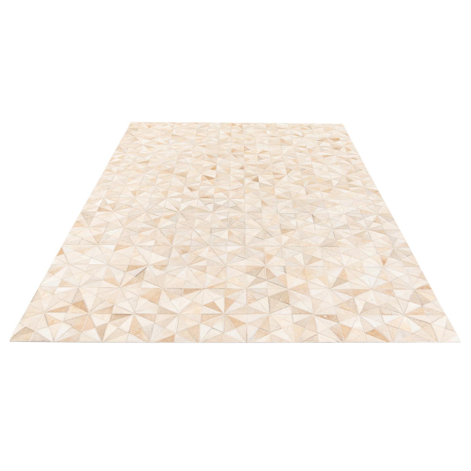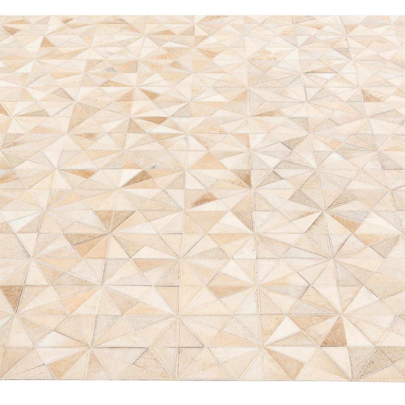A 5x7 rectangular Cowhide Stocks rug featuring a modern geometric pattern in various shades of ivory and cream.