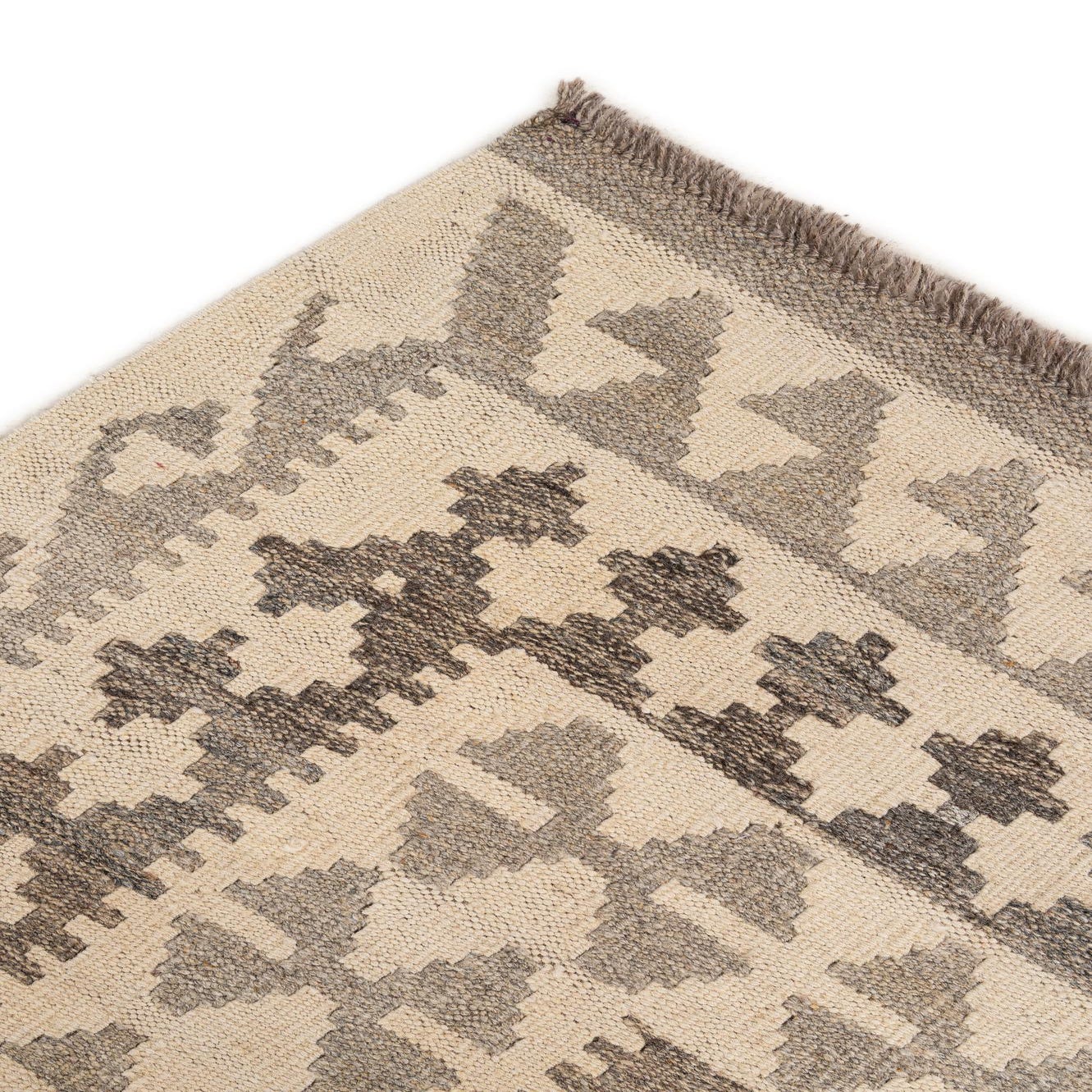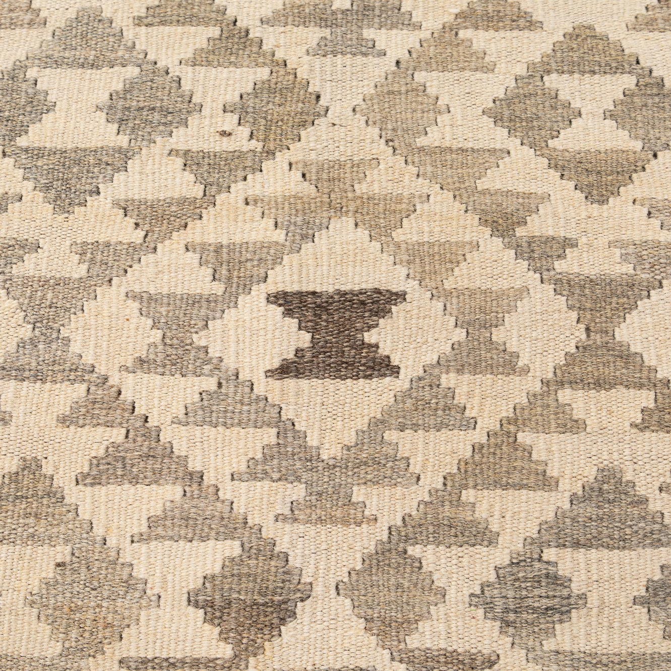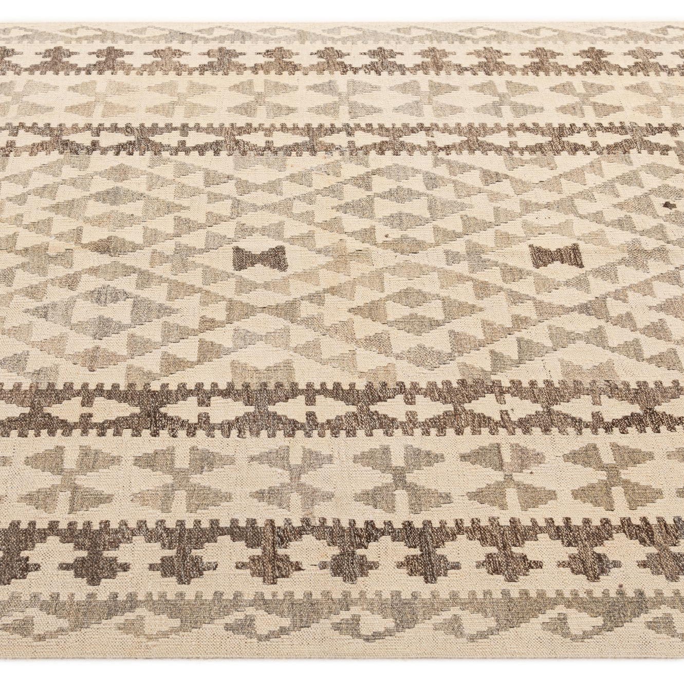 Hand-woven of 100% wool, this Kilim presents a finely detailed geometric layout rooted in traditional flatweave design. A cream background sets a light, airy field of nested diamond medallions and repeating stepped triangles, while stepped-border bands and small cross-like motifs frame the center. The neutral palette of cream, beige, brown, and gray keeps the pattern restrained and layered, allowing the geometry to read clearly without overpowering a room.