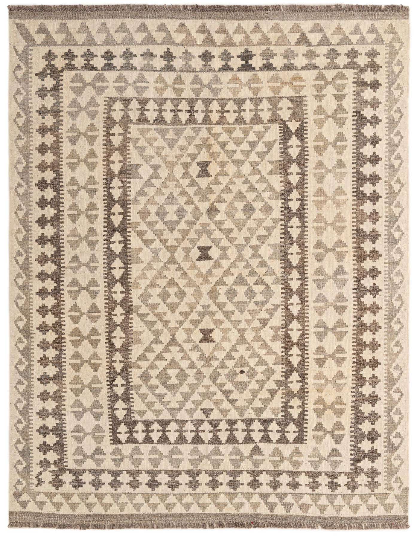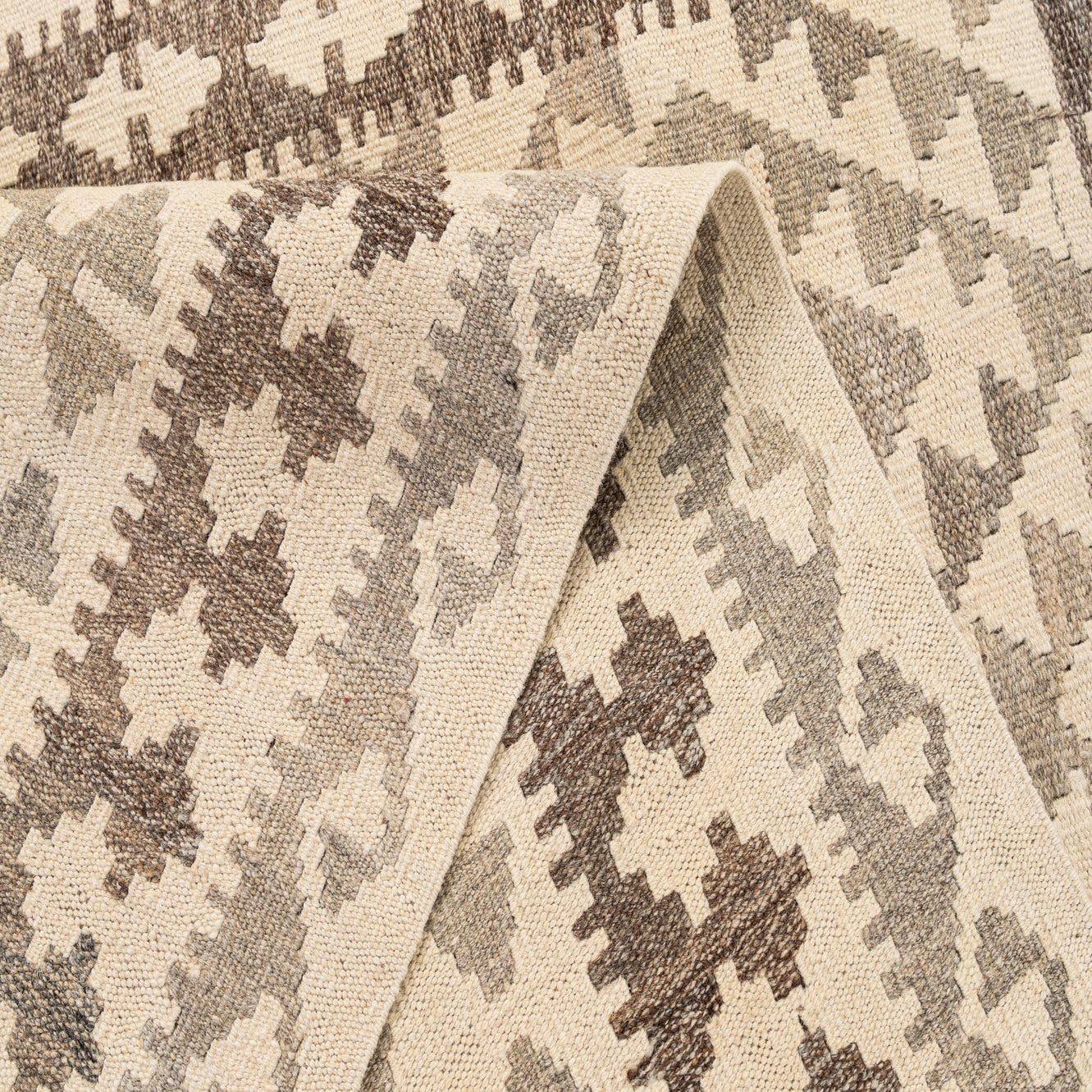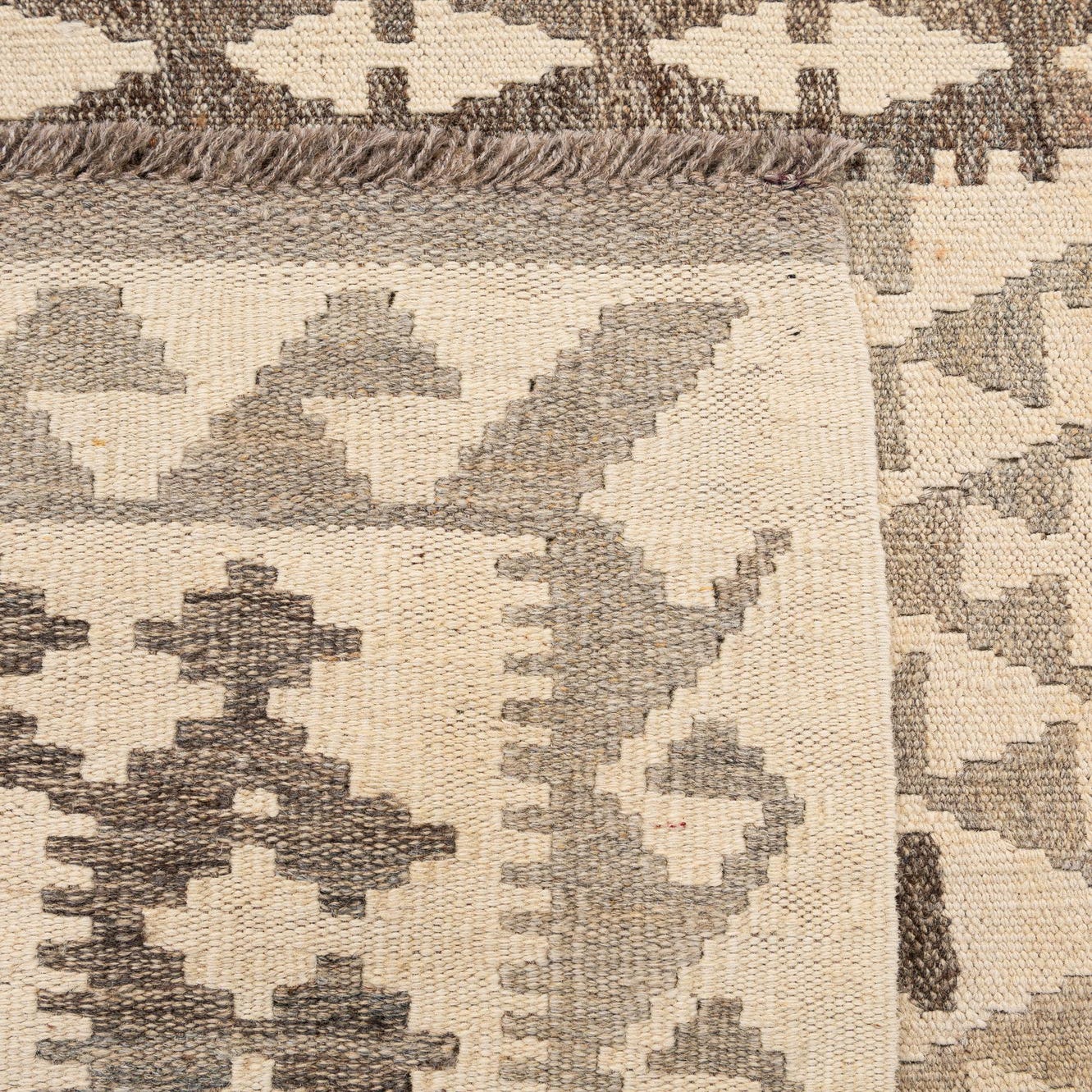 Hand-woven of 100% wool, this Kilim presents a finely detailed geometric layout rooted in traditional flatweave design. A cream background sets a light, airy field of nested diamond medallions and repeating stepped triangles, while stepped-border bands and small cross-like motifs frame the center. The neutral palette of cream, beige, brown, and gray keeps the pattern restrained and layered, allowing the geometry to read clearly without overpowering a room.