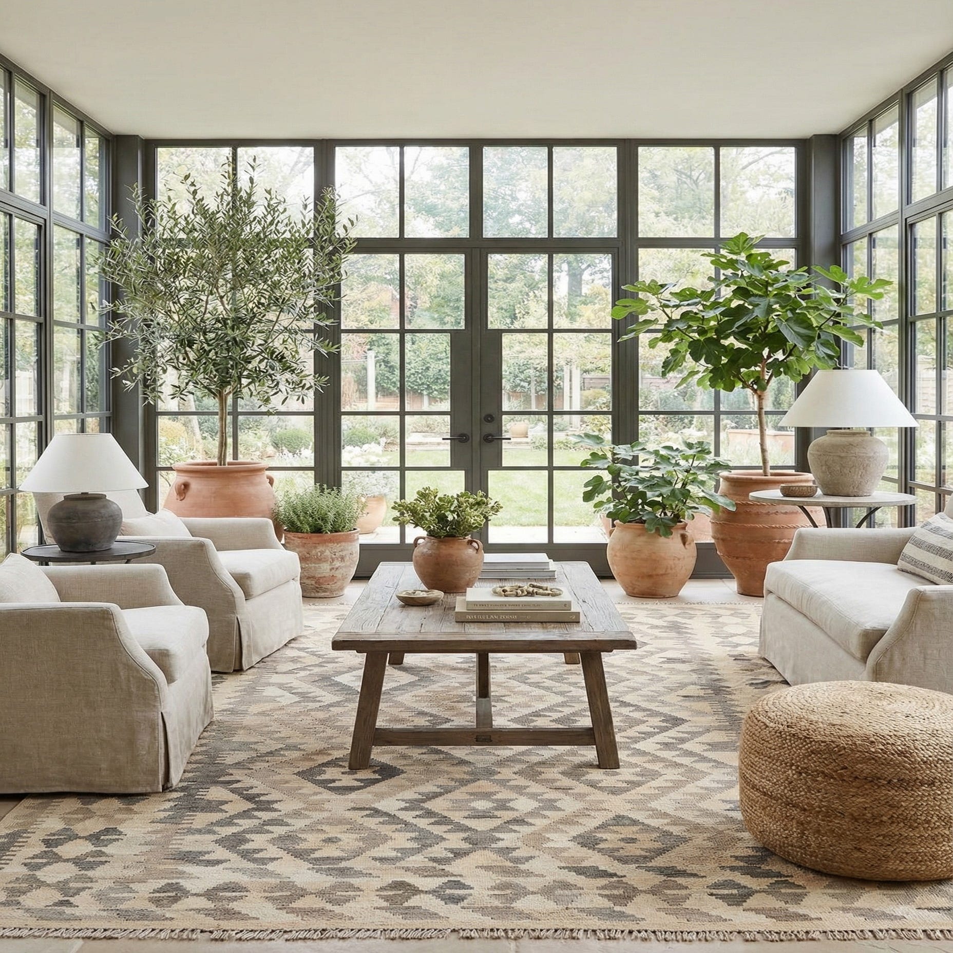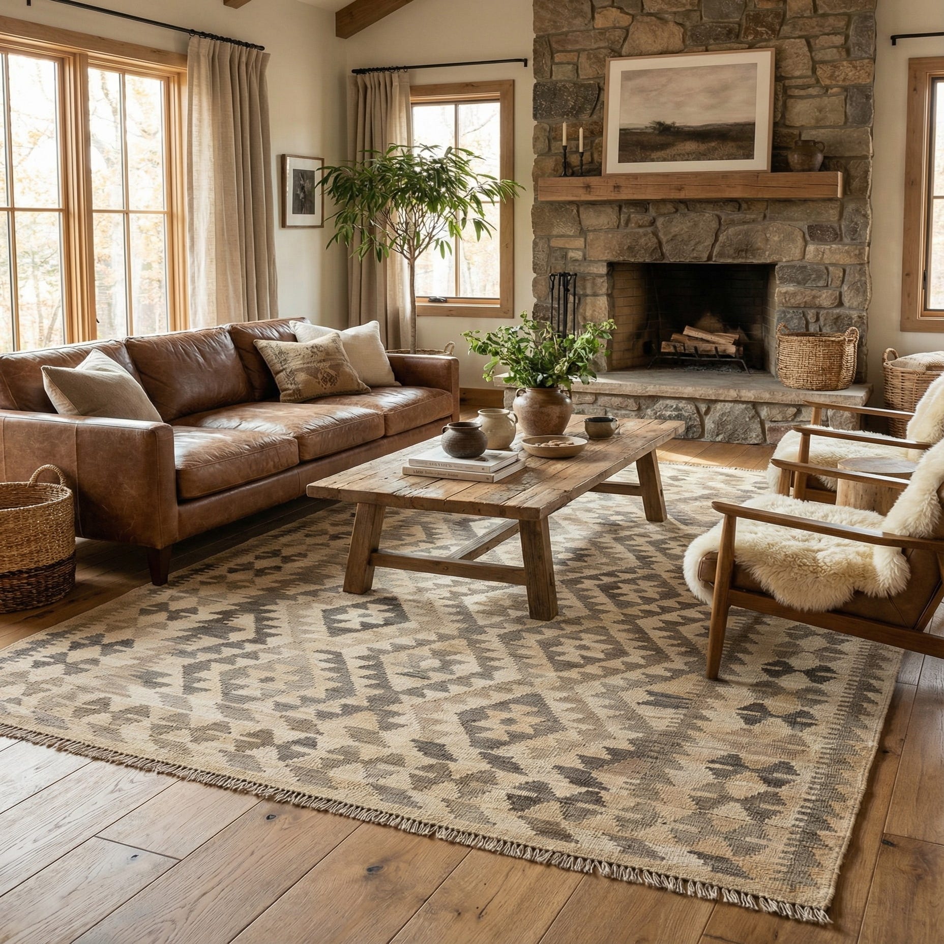 A 5x7 rectangular ivory and cream flatweave rug with a tribal geometric pattern, handmade from wool.
