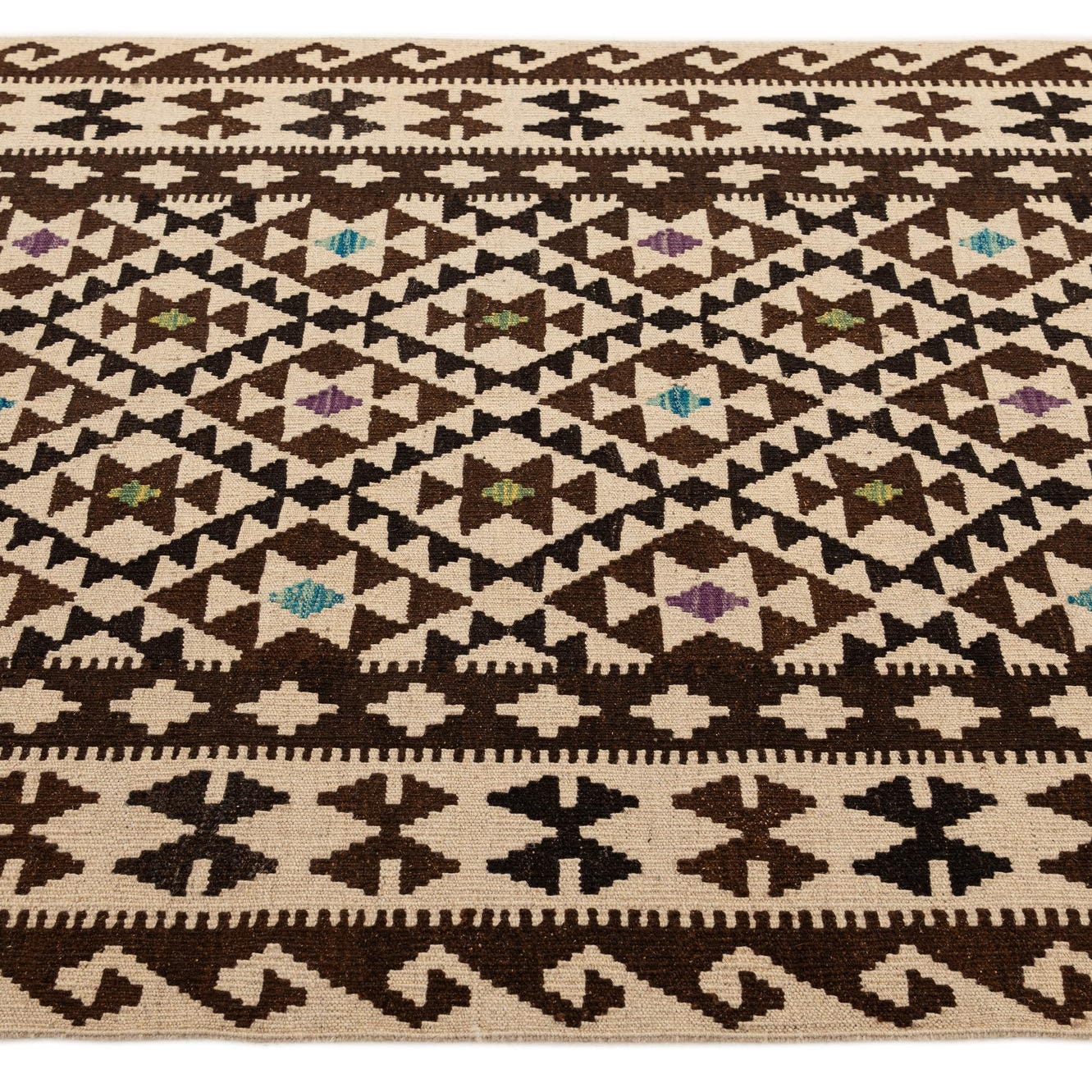 A 5x7 rectangular Kilim Maymana rug featuring a tribal geometric pattern in ivory, cream, and dark brown with subtle colorful accents.