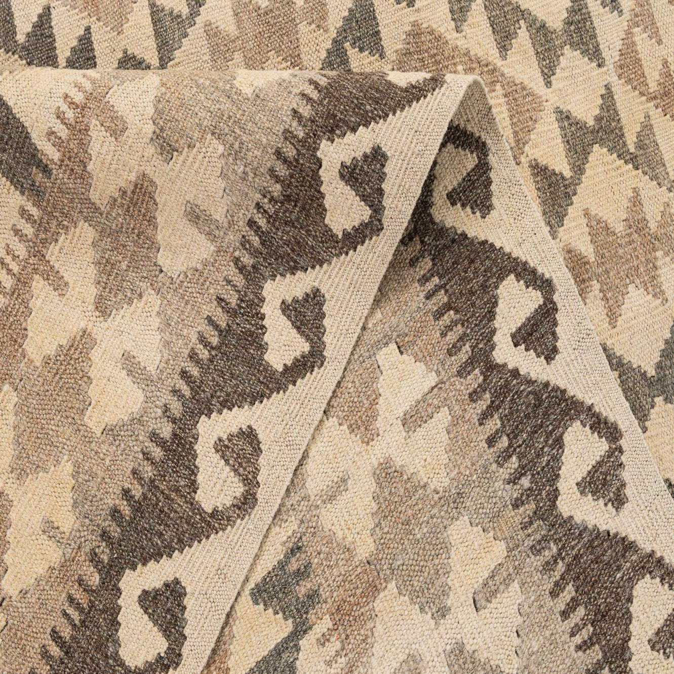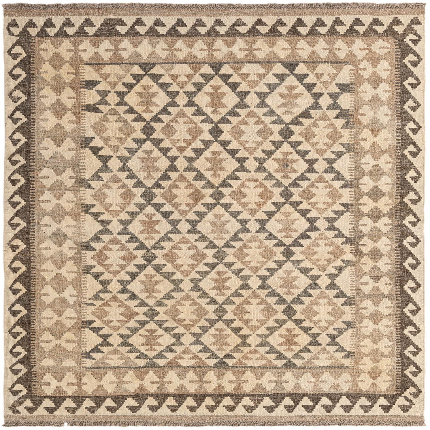 A 5x7 rectangular Kilim Maymana rug with a tribal geometric pattern in ivory, cream, and brown tones, handmade from wool.