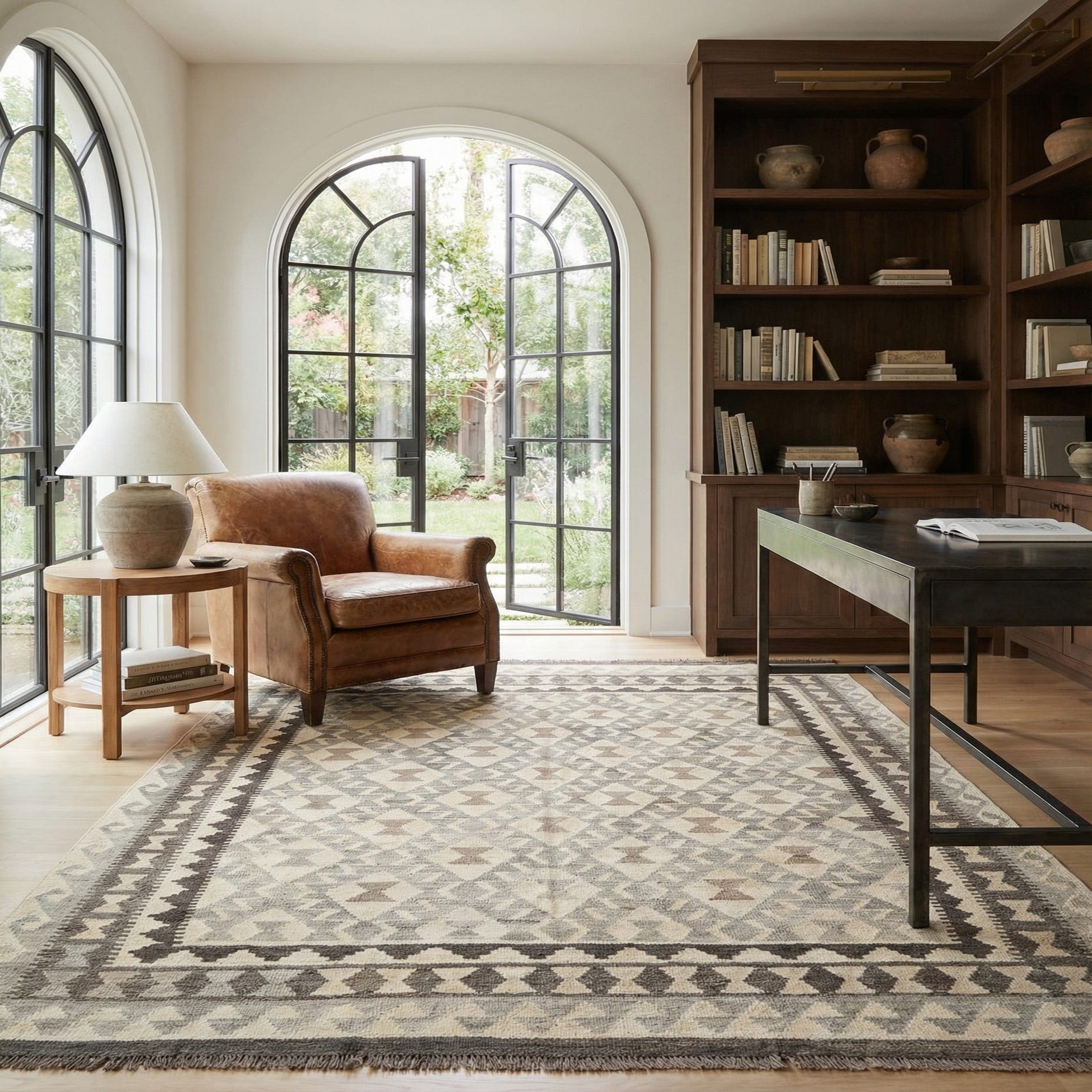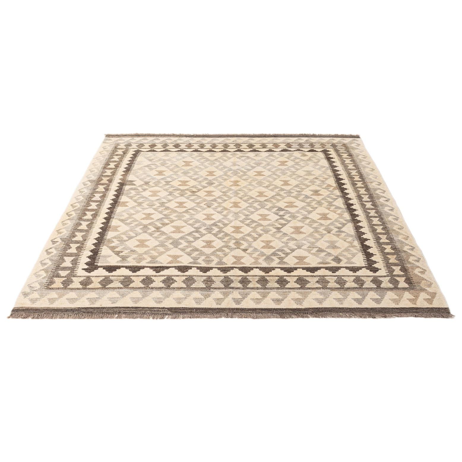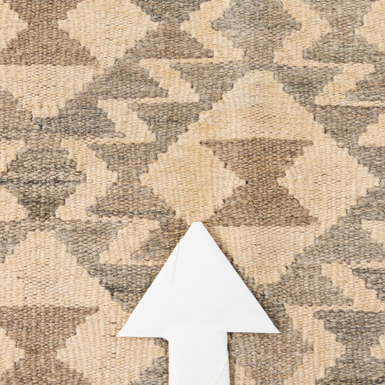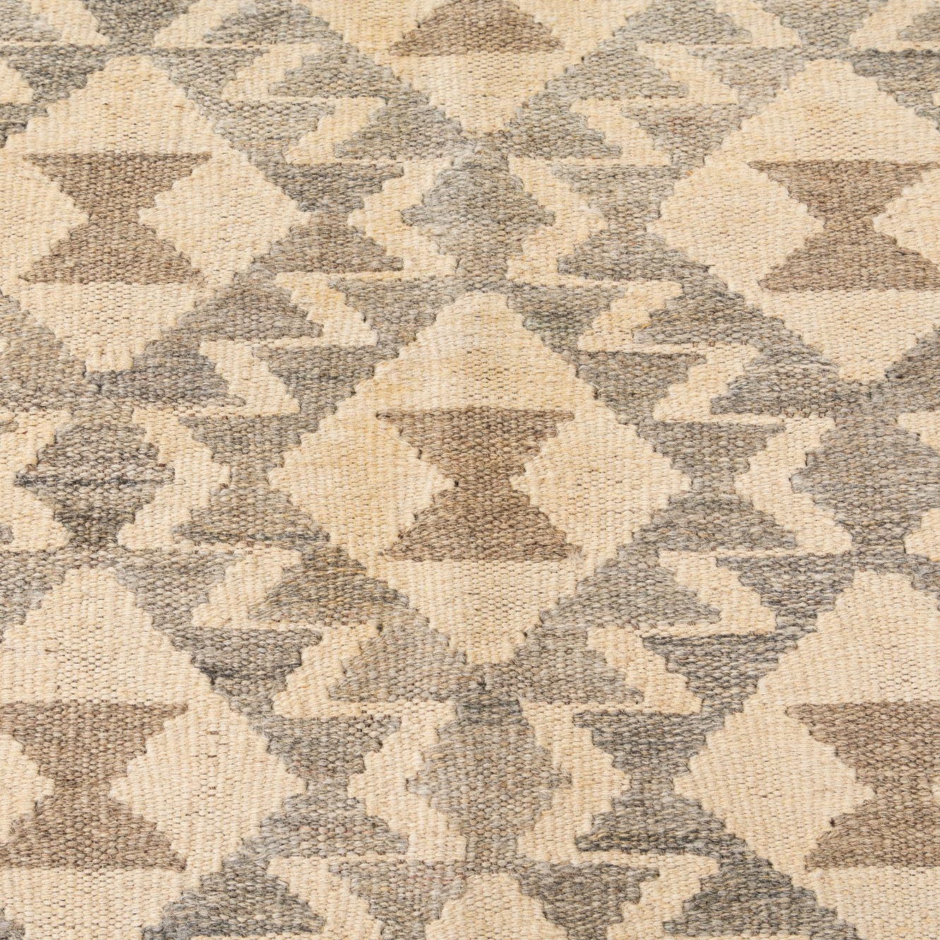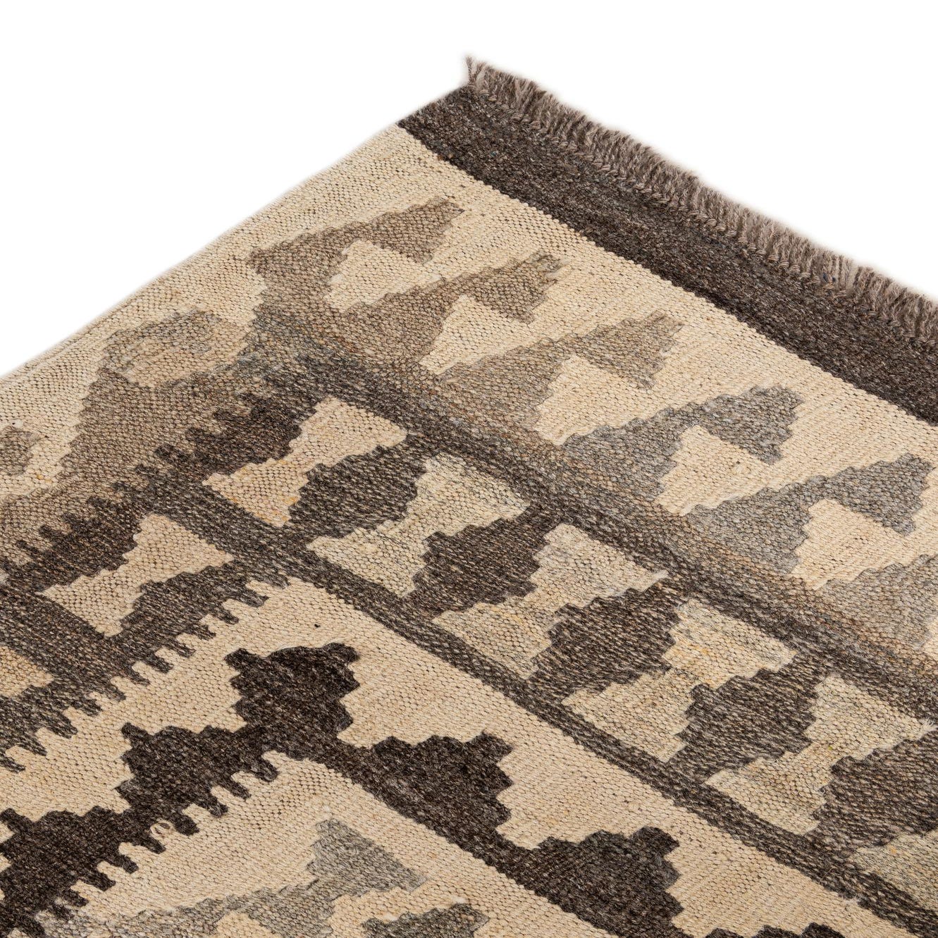 A 5x7 rectangular Kilim Maymana rug with a tribal geometric pattern in ivory, cream, and brown tones.