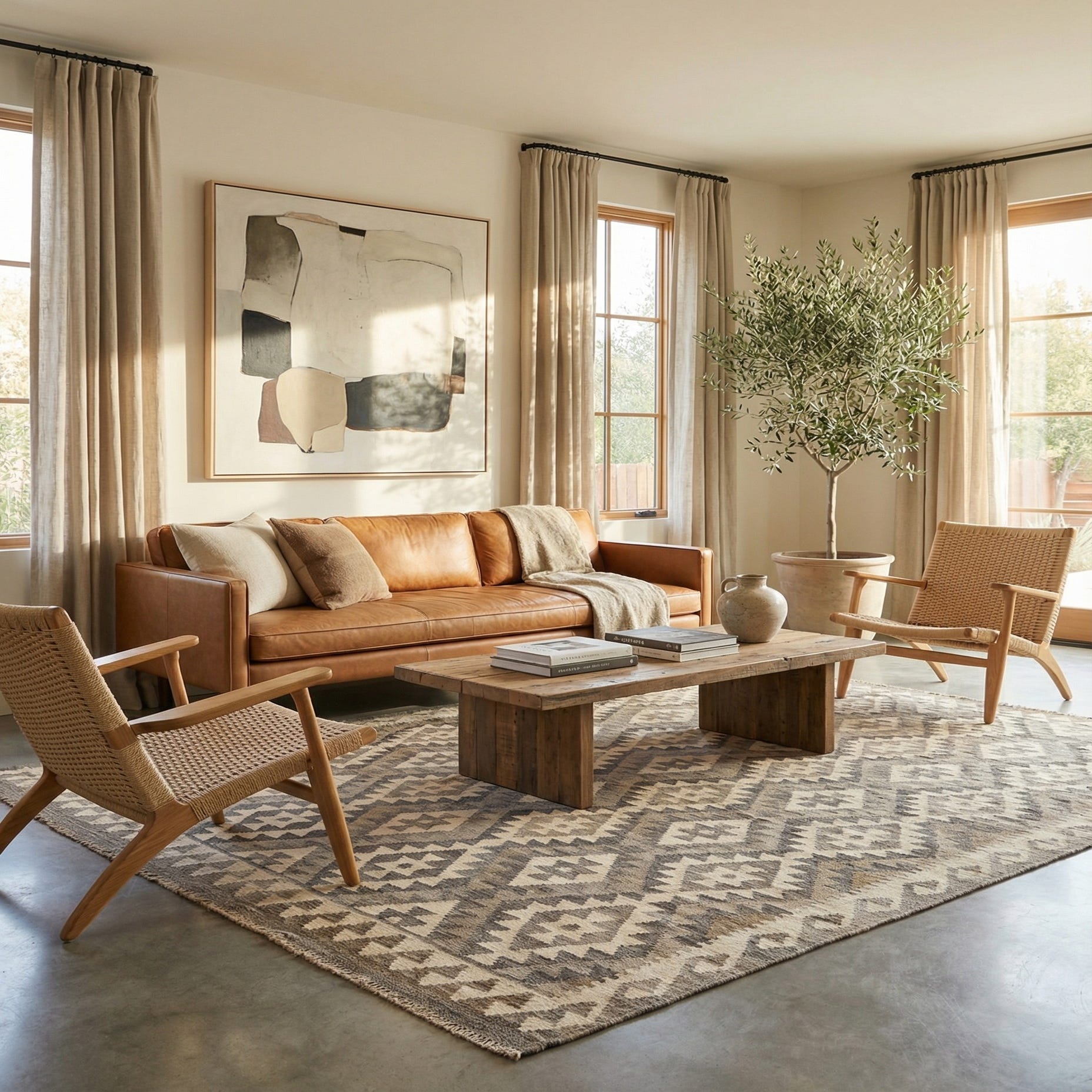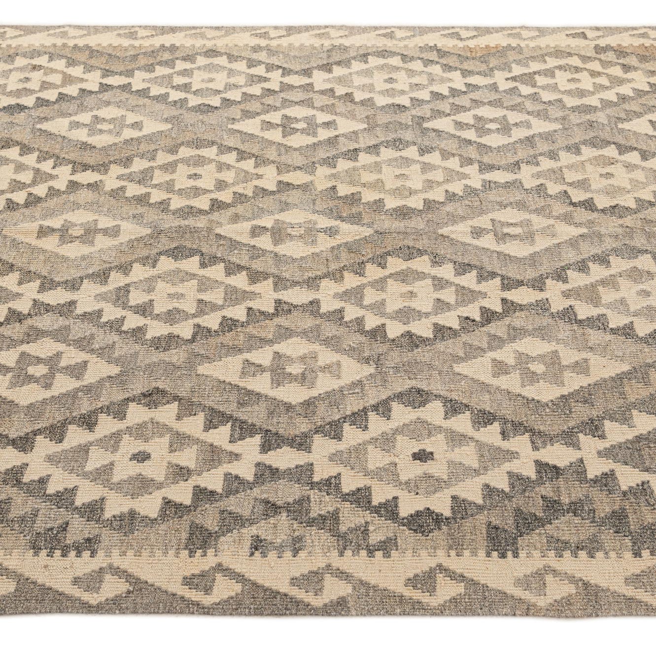 A 5x7 rectangular Kilim Maymana rug featuring a tribal geometric pattern in shades of ivory, cream, and gray.