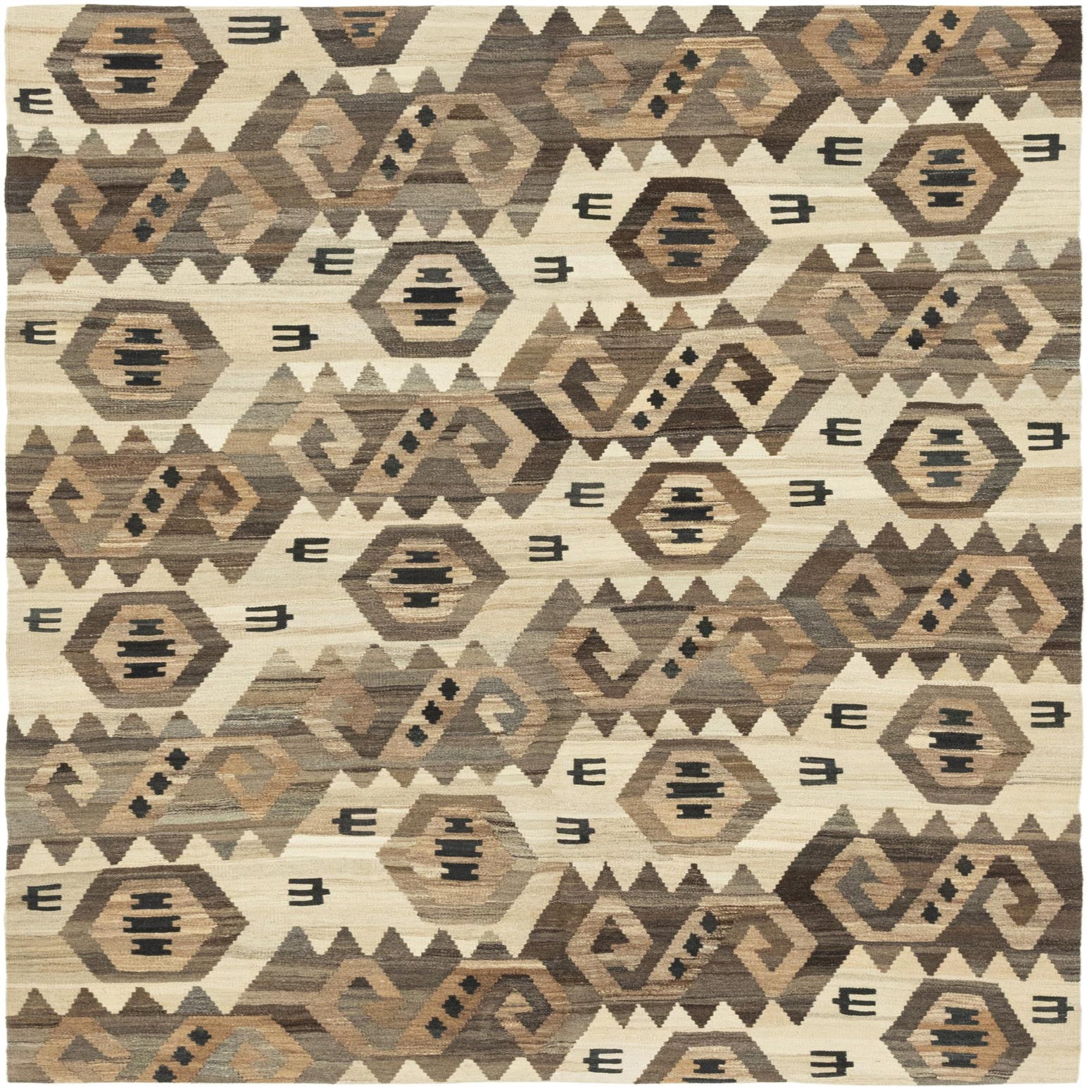 A 5x7 rectangular Kilim Modern wool rug featuring a tribal pattern in shades of ivory, cream, and brown.