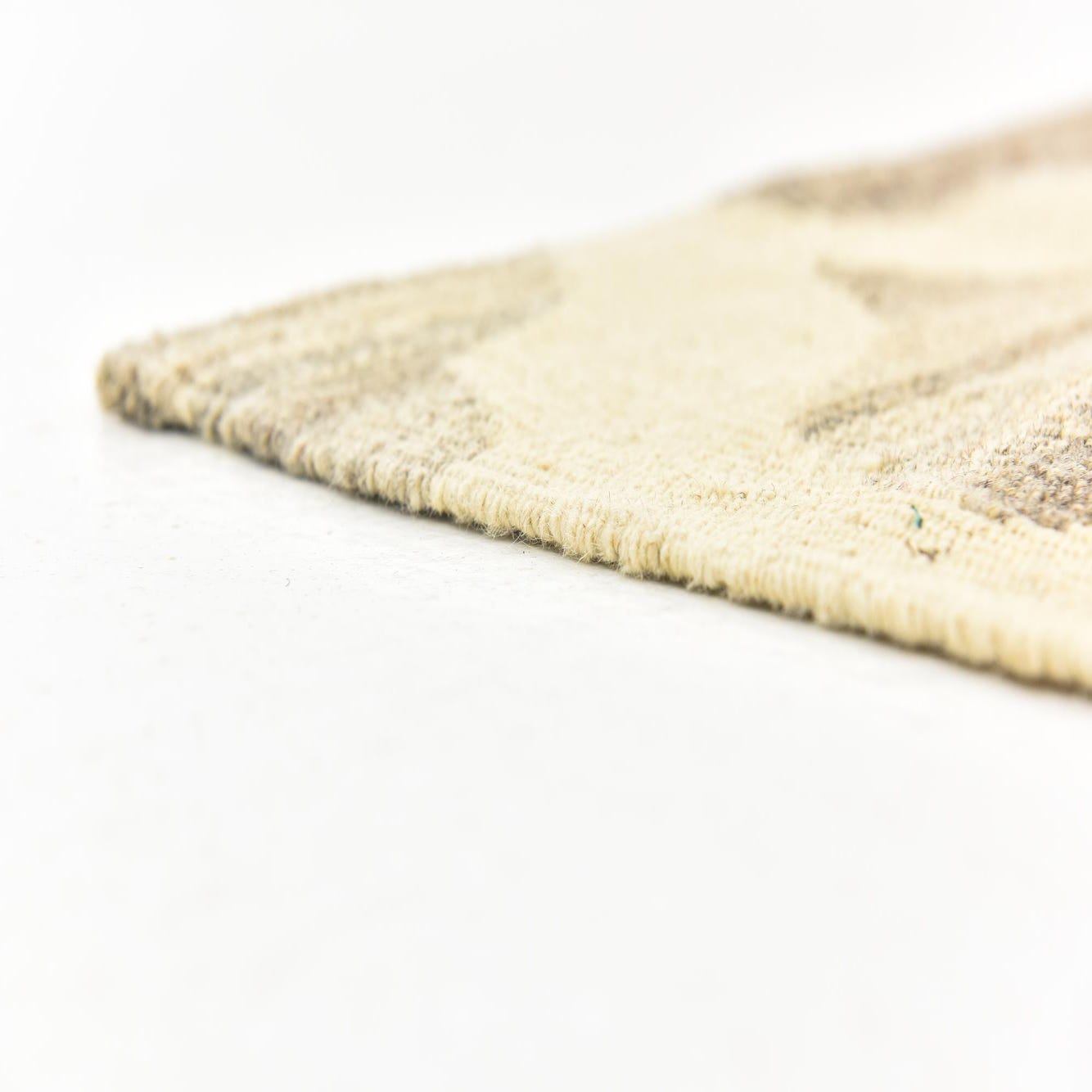 The Kilim Modern collection presents a hand-woven 5x7 wool rug that embodies contemporary design sensibilities while drawing on traditional craftsmanship. The rug showcases a geometric pattern with a distinct sense of movement and rhythm, featuring a series of interconnected diamond shapes in a harmonious blend of cream, beige, and light brown hues. The cream background provides a neutral base that accentuates the textured appearance of the pattern.