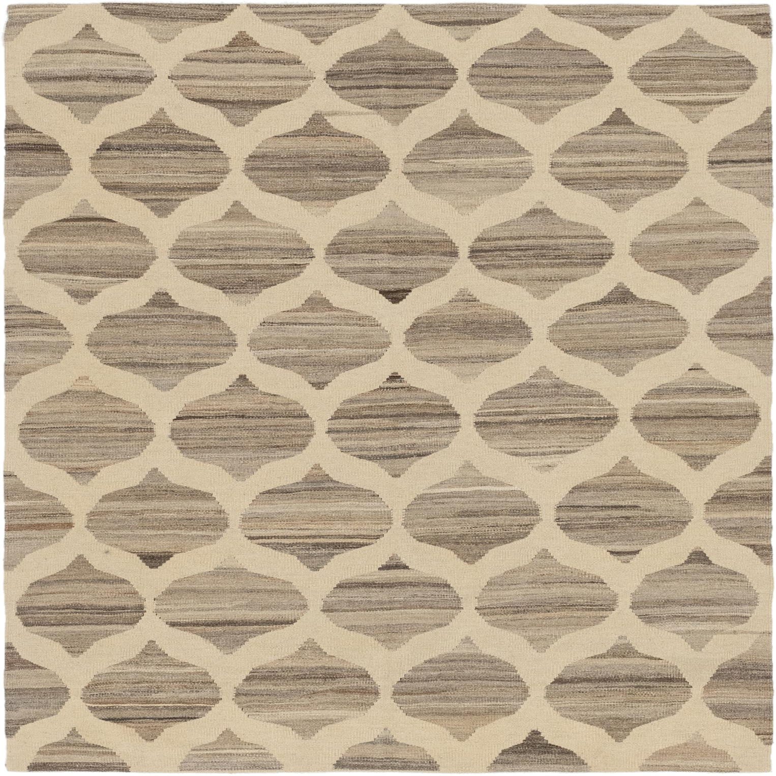 A 5x7 rectangular ivory and cream flatweave wool rug with a repeating transitional tribal pattern.