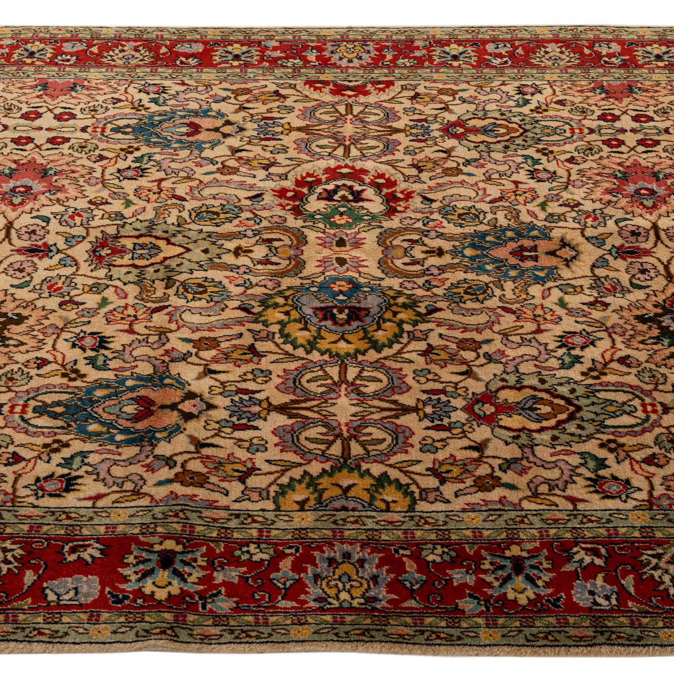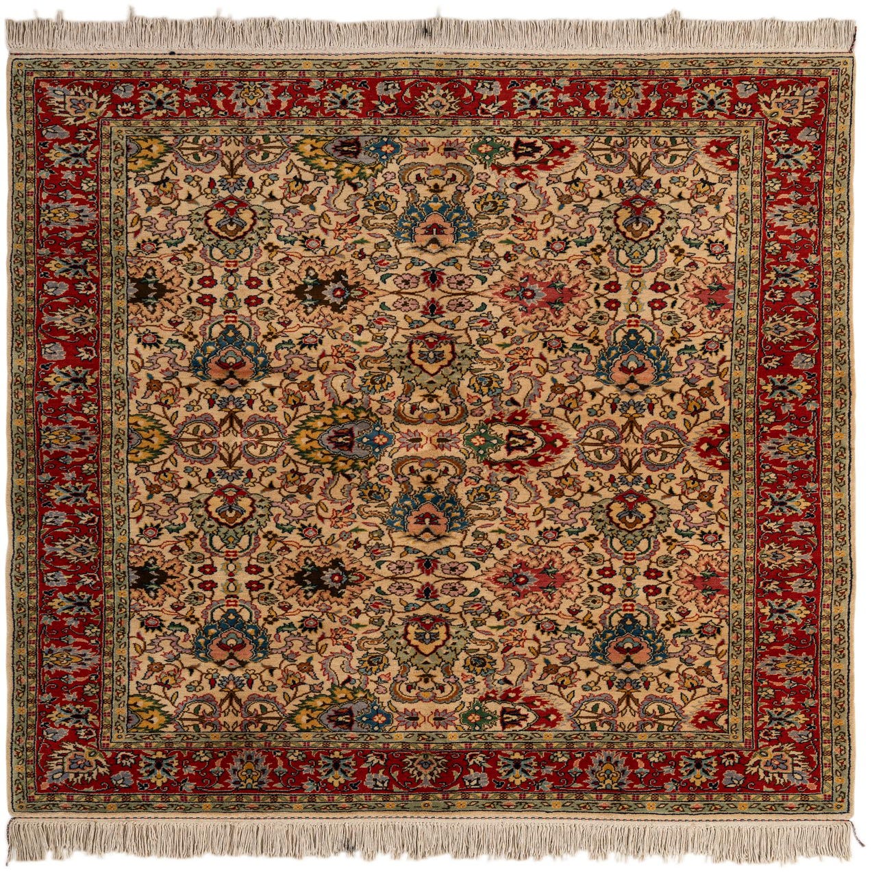 A 5x7 rectangular Lahour rug featuring a detailed traditional Oriental pattern with a cream field and a rich red border, made of 100% wool.