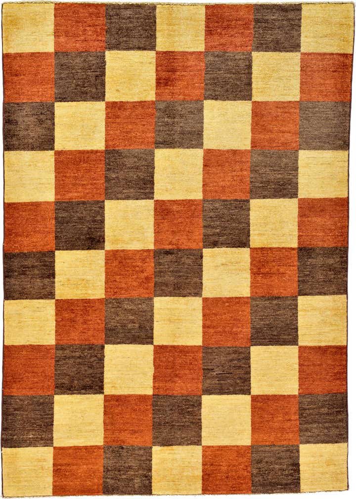 The Modern Ziegler collection presents a 5x7 hand-knotted rug crafted from 100% hand-spun wool, offering a plush and tactile underfoot experience. This particular rug showcases a bold geometric pattern of large-scale checkered blocks, rendered in a warm and inviting palette of cream, brown, and rust red. The cream background provides a neutral base that complements the piece's robust, earthy tones, which could add warmth and structure to a room.