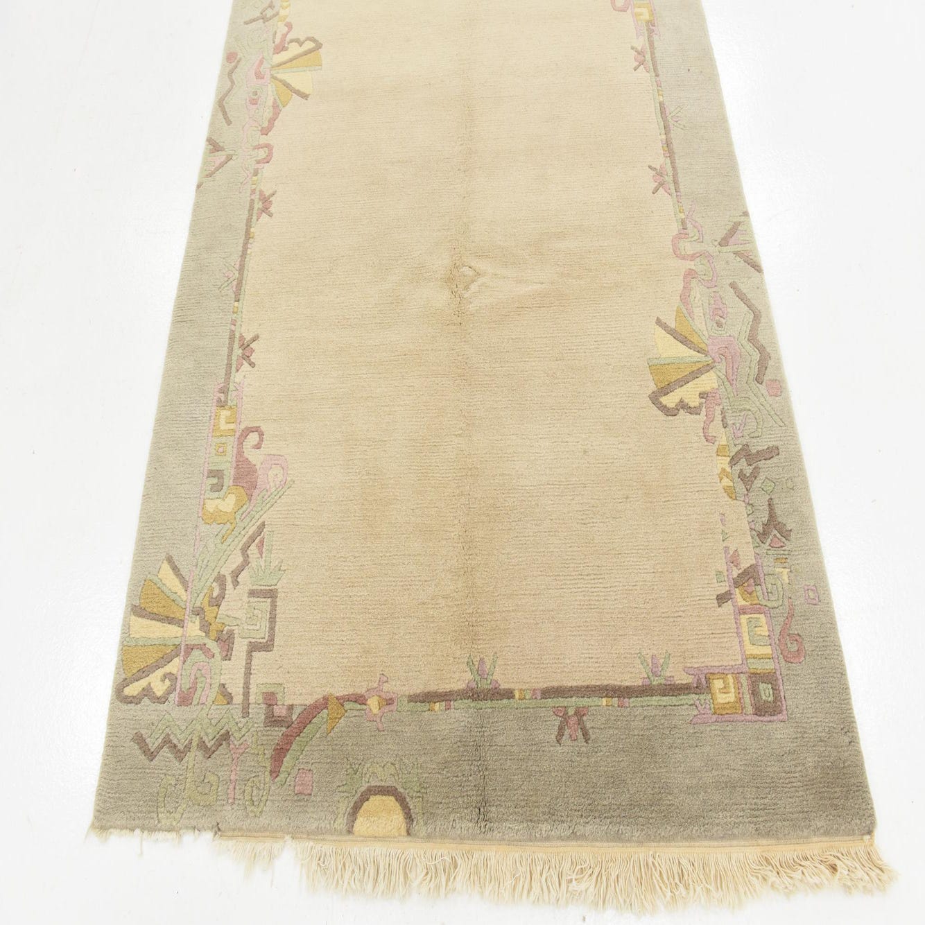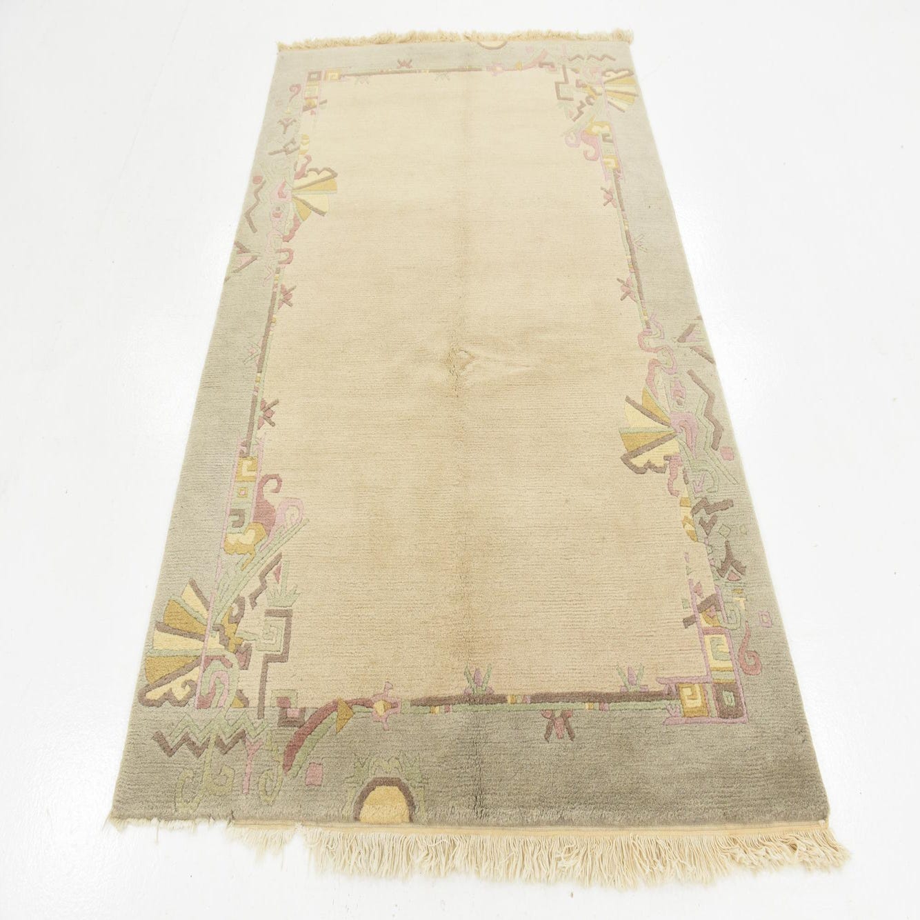 A 5x7 rectangular ivory wool rug with a light sage green border featuring traditional and modern oriental patterns in muted pink, yellow, and brown.
