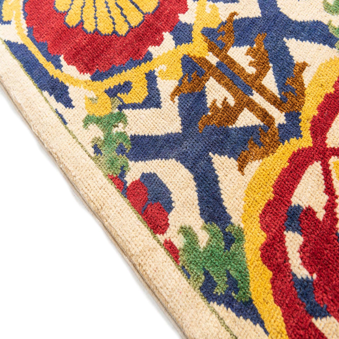 Primary color is Cream. Colors in this rug include: Cream, Brown, Green, Red, Yellow, Navy Blue.