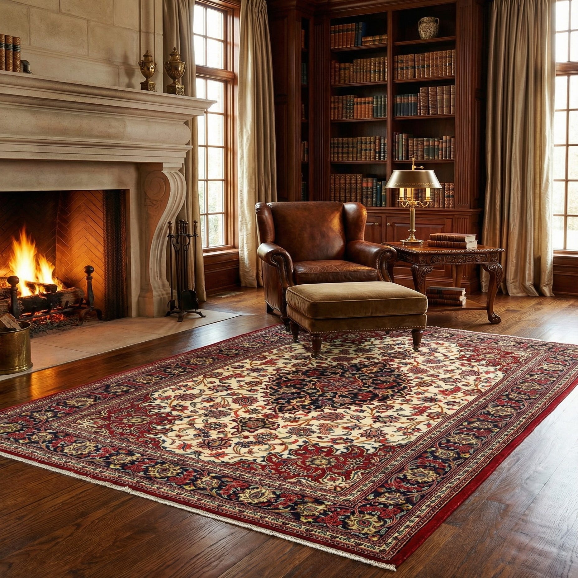 Crafted with care, the rug's wool construction ensures a soft, durable texture that both comforts and withstands the demands of daily use. The design's symmetry and classic color palette make it a versatile piece ideal for a wide range of interior scenarios, from complementing the polished wood surfaces of a traditional study to adding warmth and character to a chic, modern living space. The rug would also serve as a striking contrast to minimalist decor, providing a focal point and a touch of sophistication.