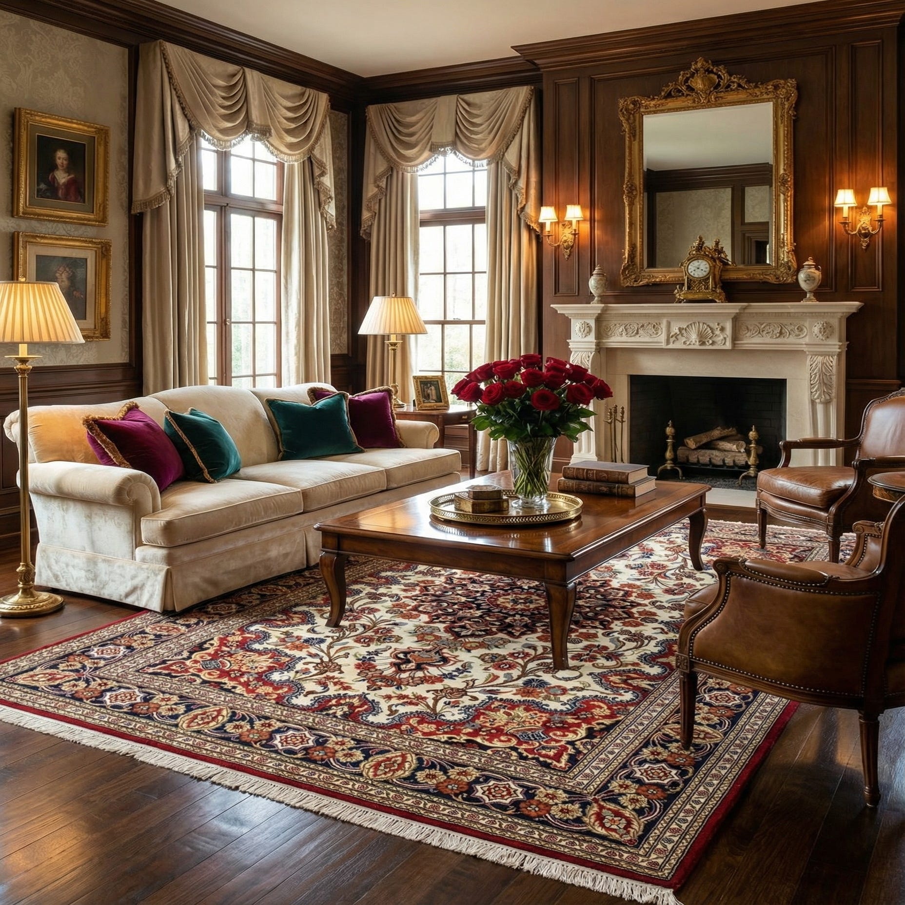 A 5x7 rectangular ivory Persian rug with an intricate red, navy, and gold floral medallion pattern, suitable for a living room.