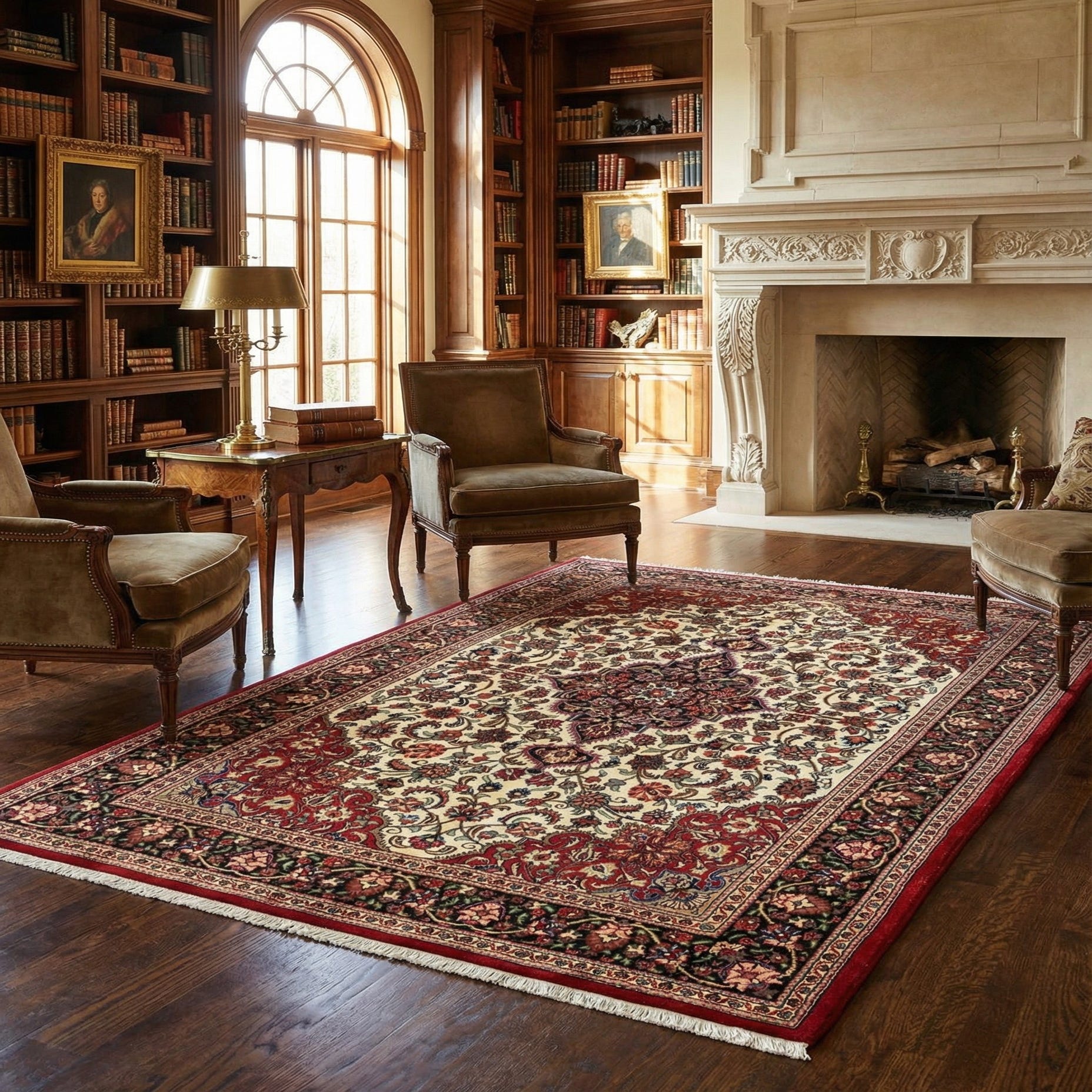 A 5x7 rectangular Persian Qom rug with an ivory field, red border, and intricate floral patterns.