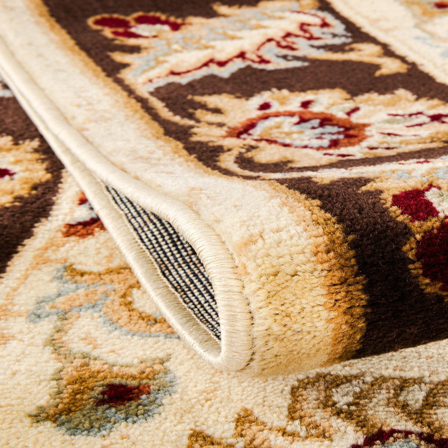 This rug anchors seating areas and formal spaces alike; place it beneath a coffee table to ground a living room grouping, or layer it under a dining table to add classic pattern without overwhelming the room. Its cream ground brightens a space while the brown border provides visual weight, making it well suited to traditional, transitional, or farmhouse interiors and pairing neatly with warm wood furniture, leather sofas, or neutral upholstery accented by light blue or green textiles.