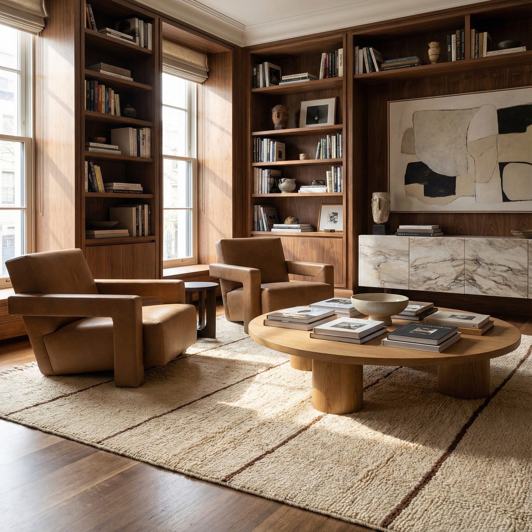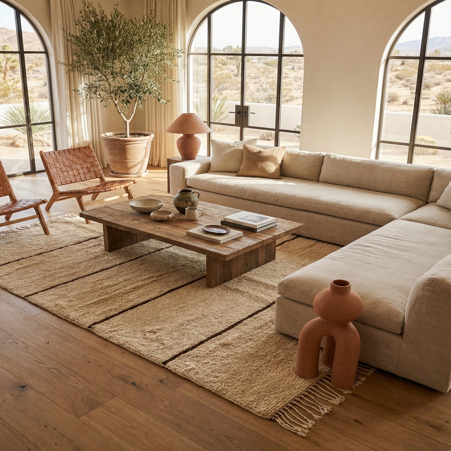 A 5x8 rectangular ivory wool rug with horizontal brown stripes and fringe, suitable for a living room.