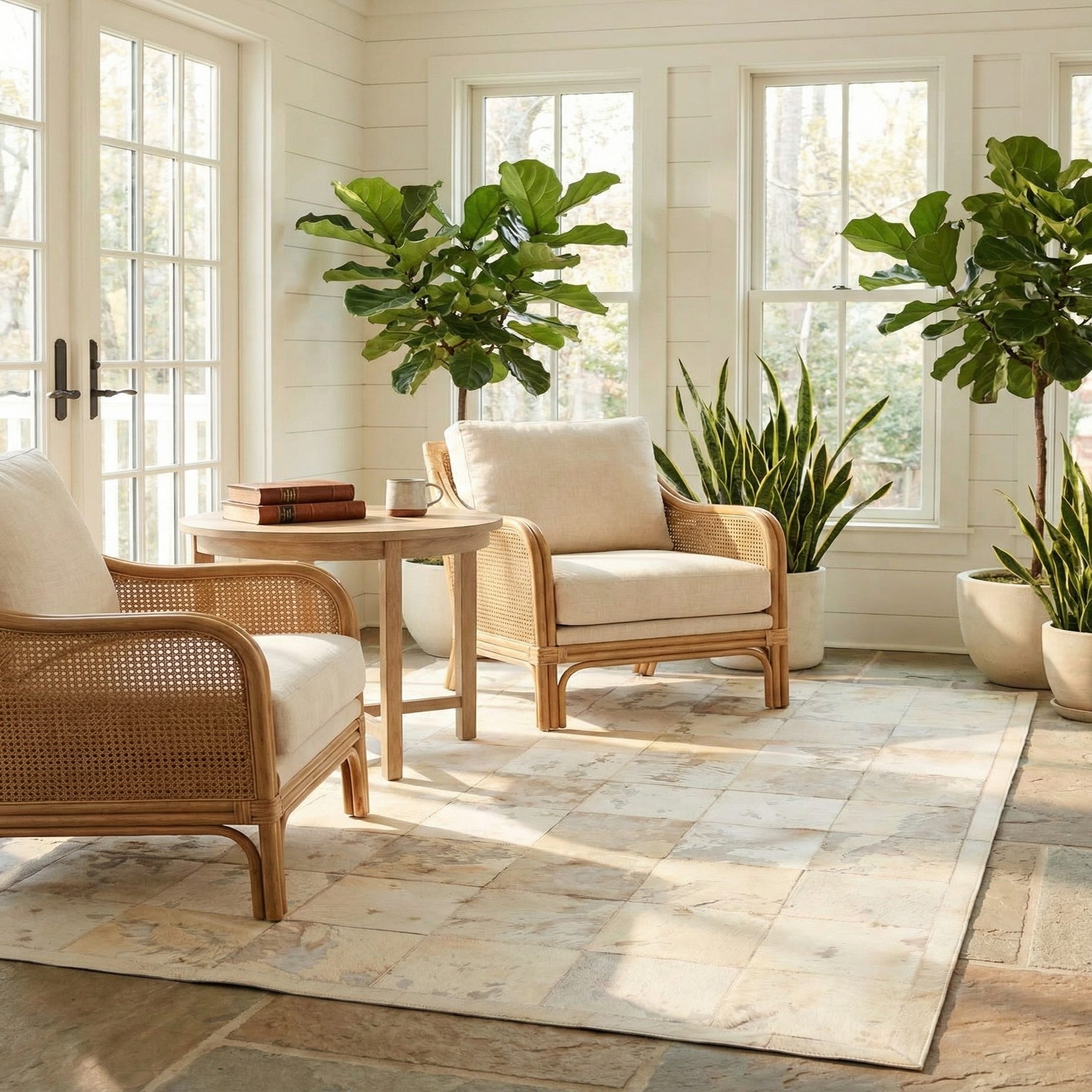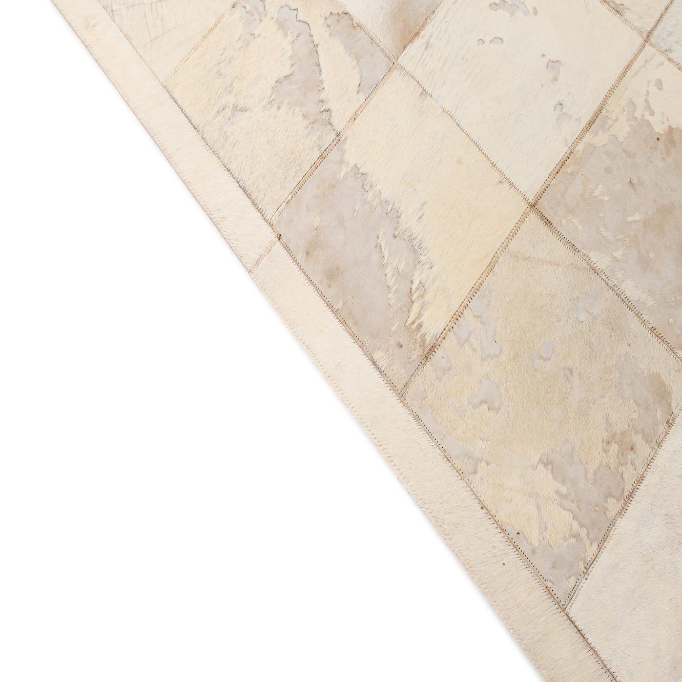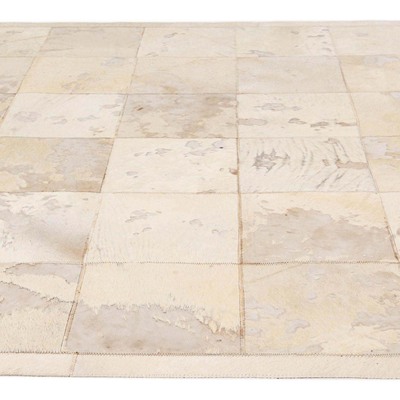 A 5x8 rectangular ivory cowhide patchwork rug with natural variations in cream and light brown tones, suitable for a modern living room.