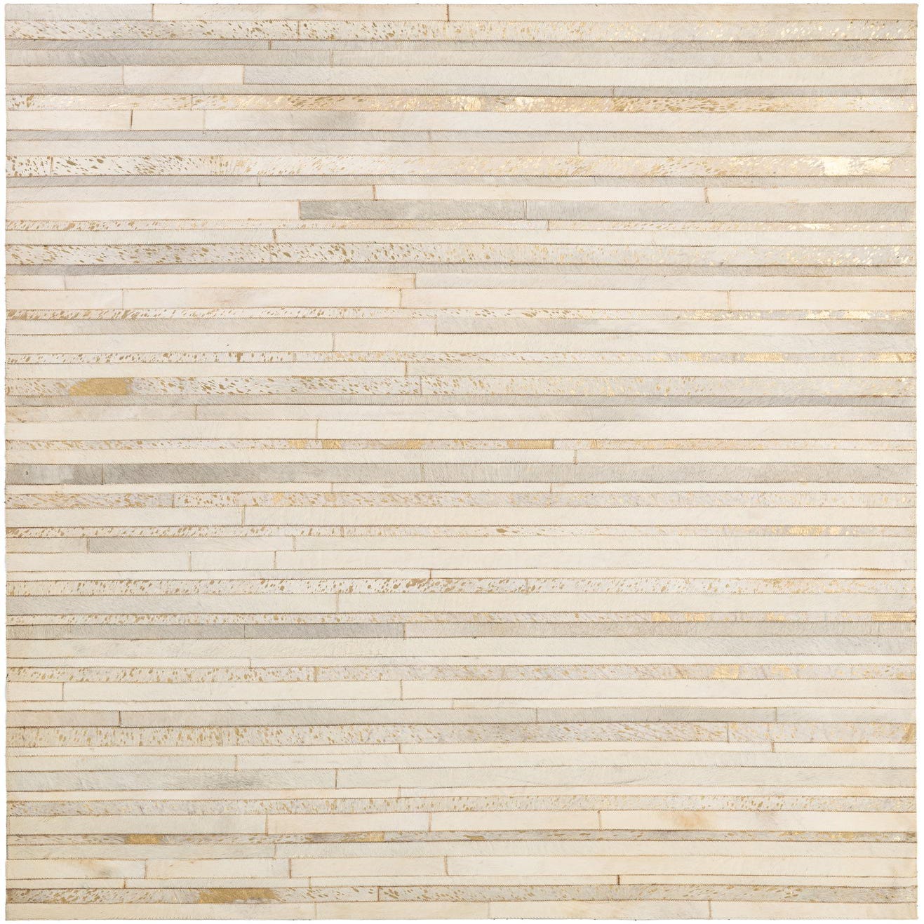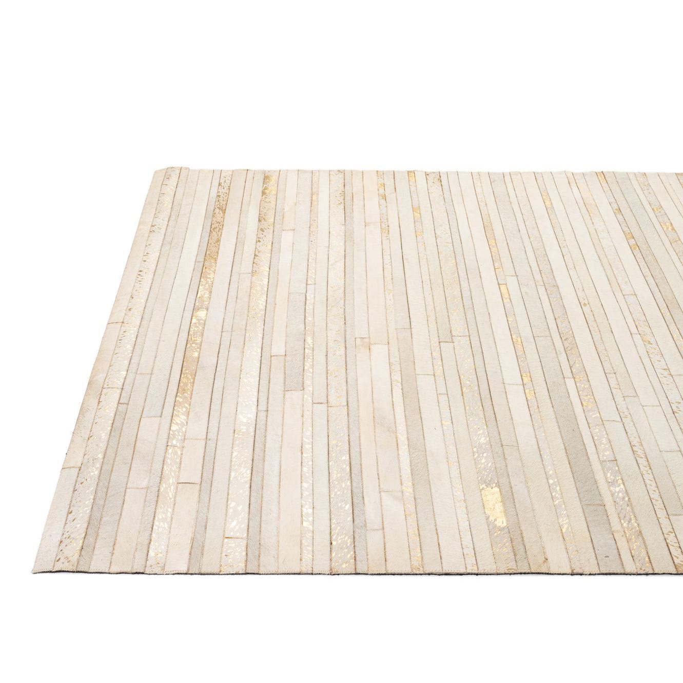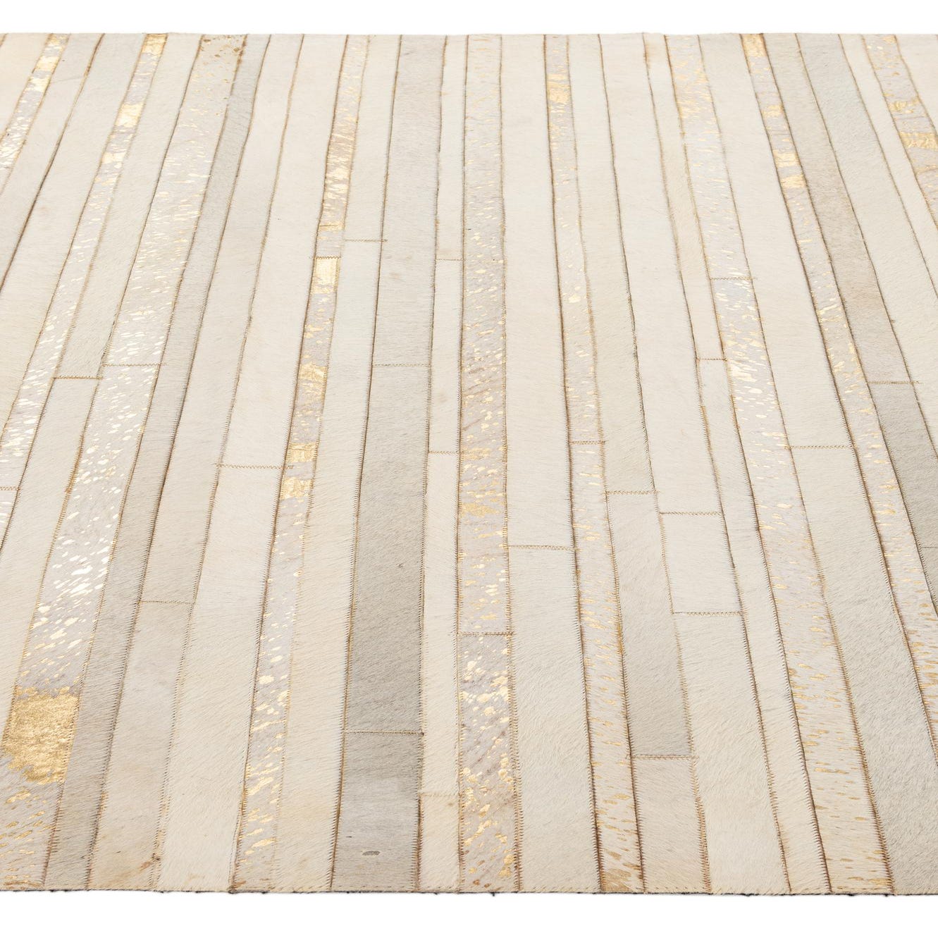 A 5x8 rectangular ivory cowhide rug with a modern stripe pattern, featuring alternating cream and metallic gold leather strips.