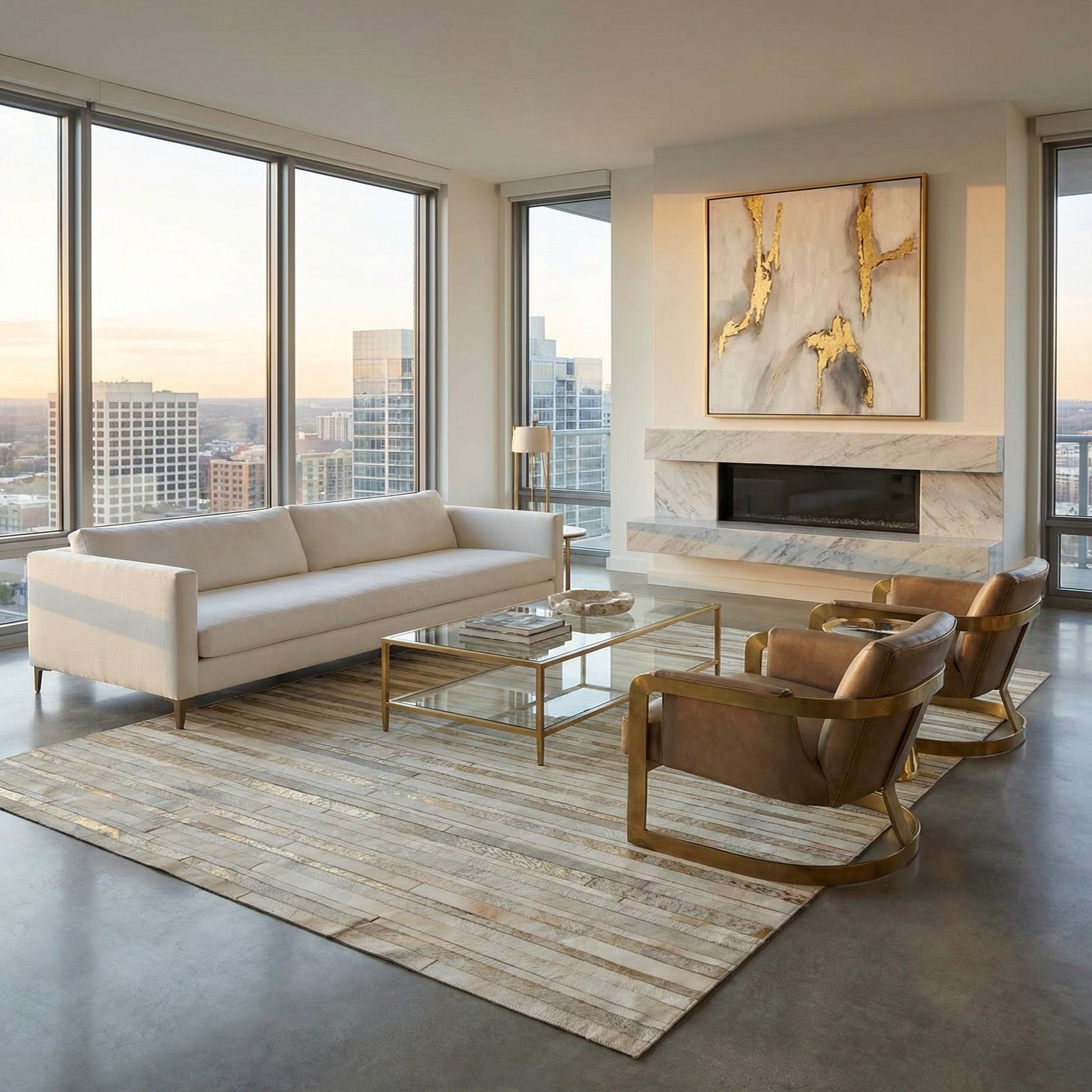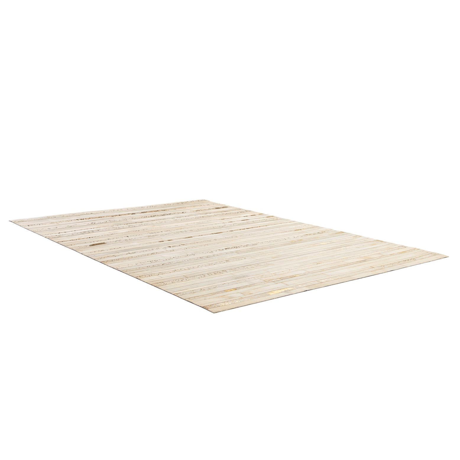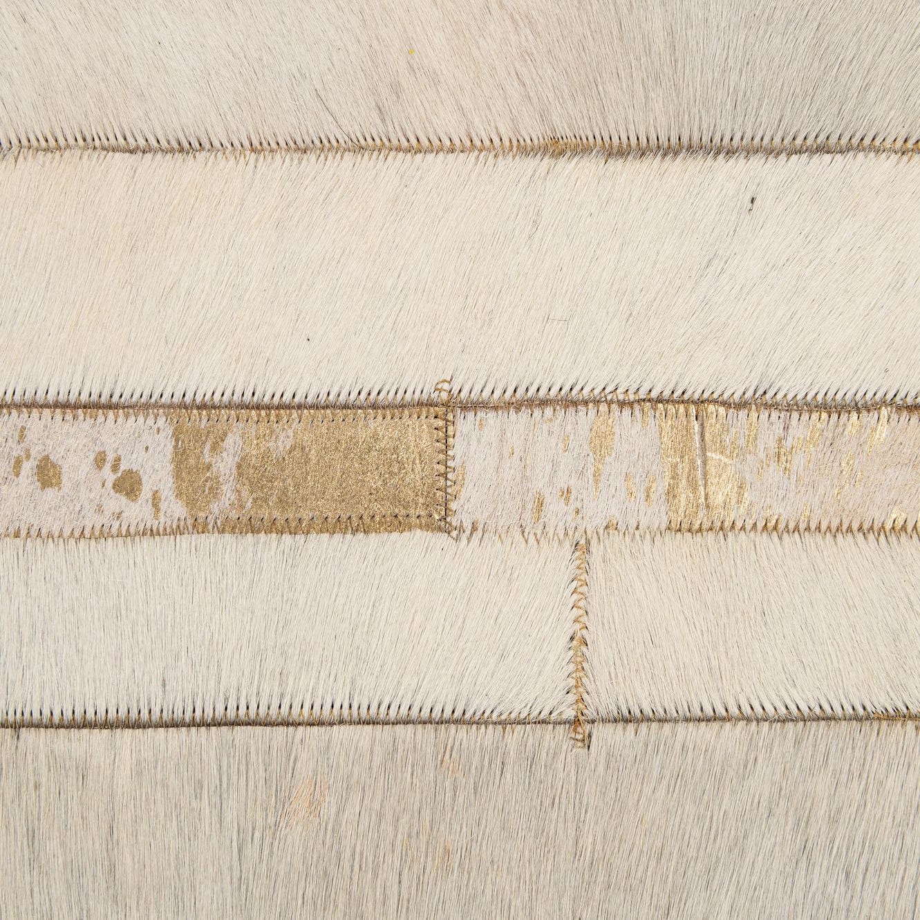 A 5x8 rectangular ivory cowhide rug with a modern stripe pattern, featuring alternating cream and metallic gold leather strips.