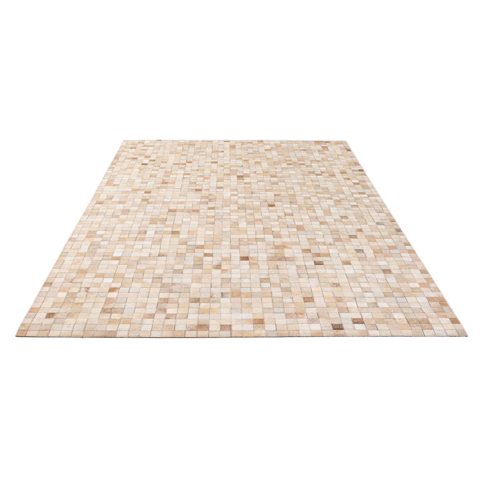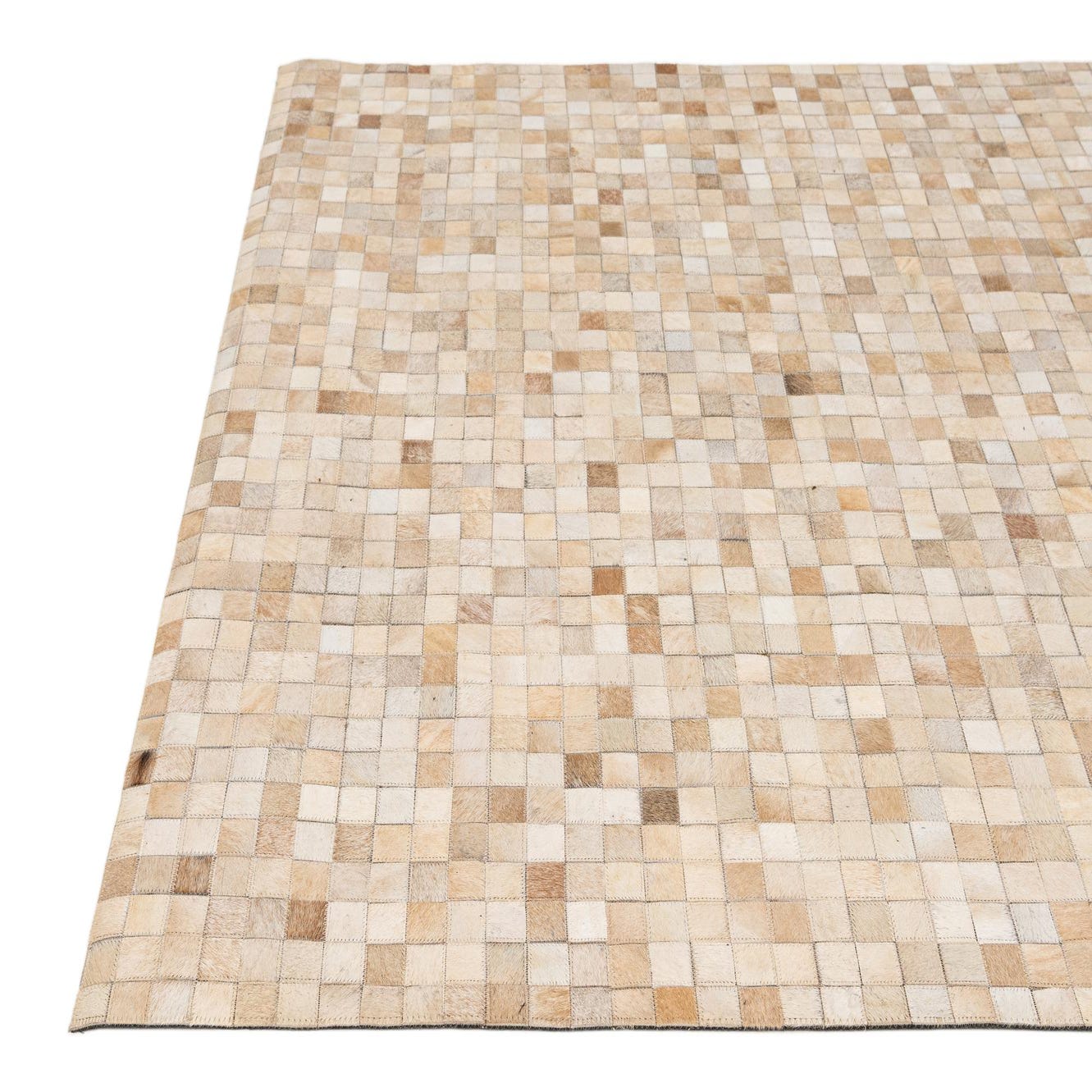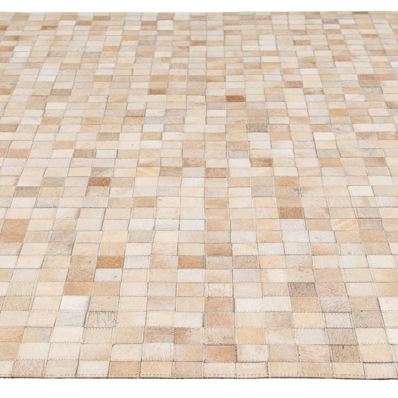 A 5x8 rectangular Cowhide Patchwork rug in varied ivory and cream tones, featuring a modern square tile pattern.