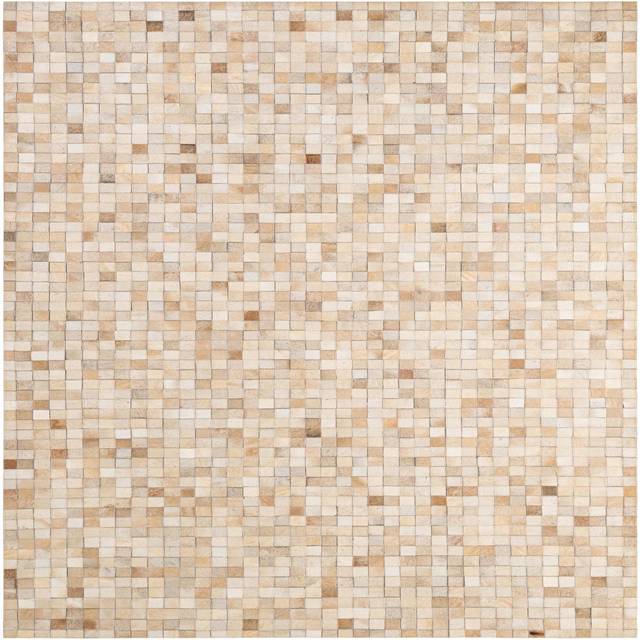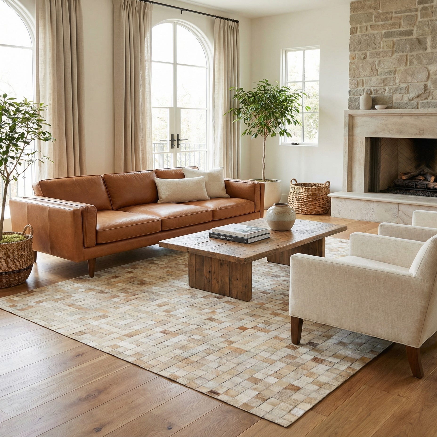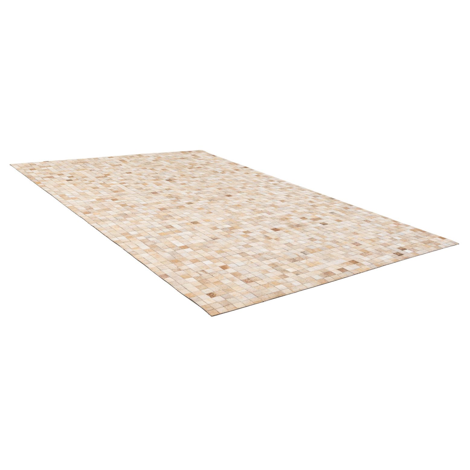A 5x8 rectangular Cowhide Patchwork rug in varied ivory and cream tones, featuring a modern square tile pattern.