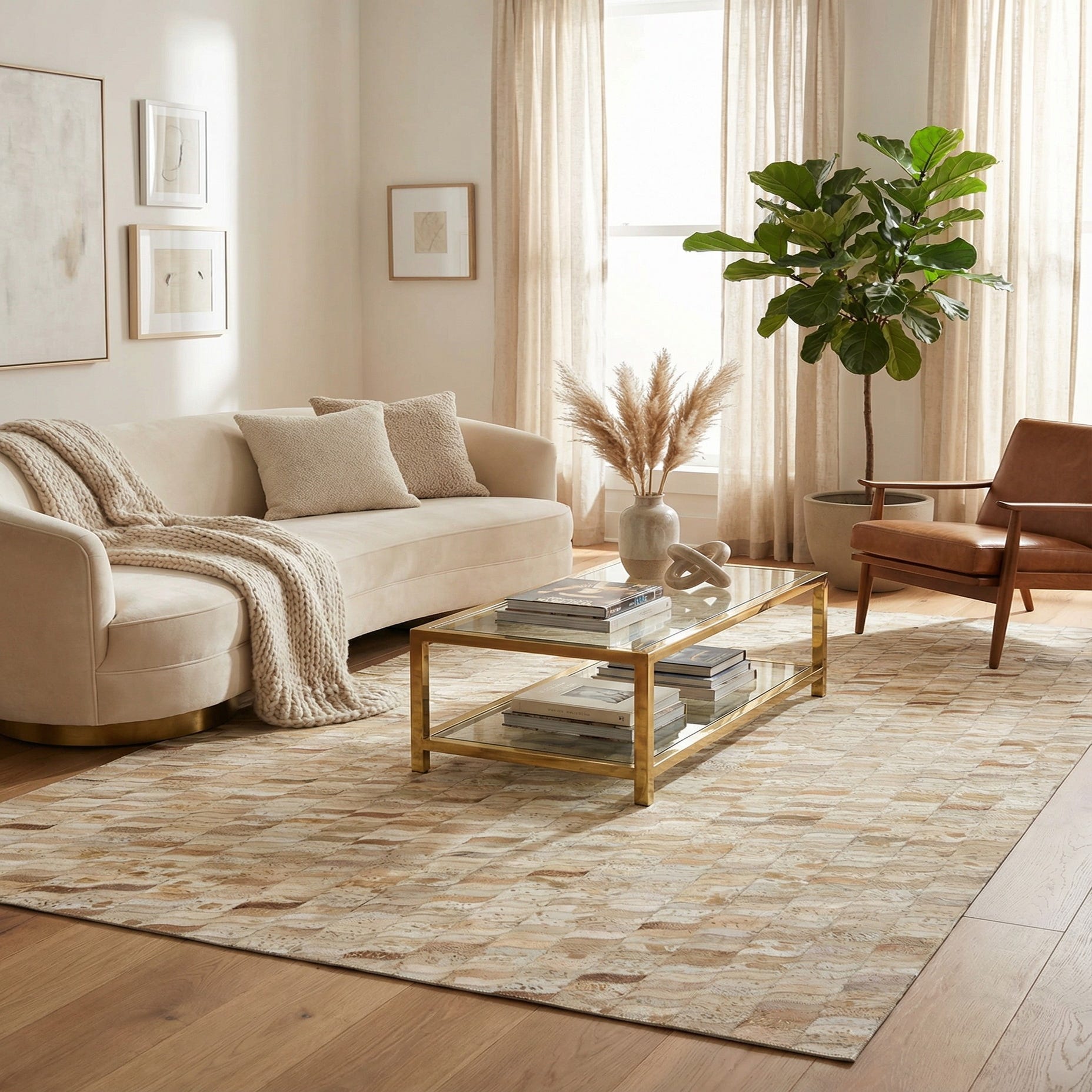Well-suited to neutral, modern, or transitional interiors, this rug grounds a living room beneath a coffee table, adds layered texture at the foot of a bed, or brings warmth to a home office or foyer. Pair it with light wood furniture, woven linens and muted metallic accents for a calm, collected look, or use it to soften contemporary leather seating and natural-fiber upholstery.