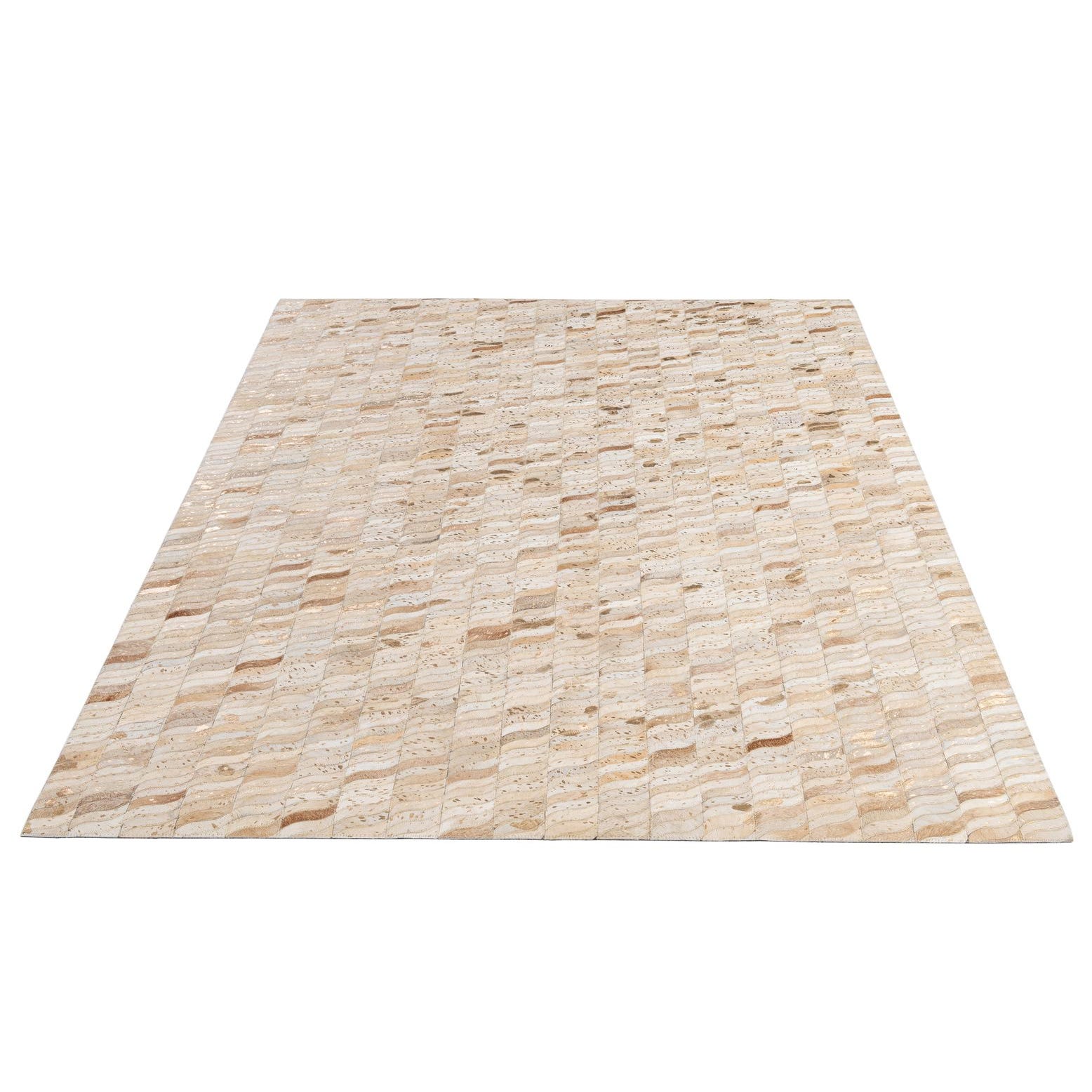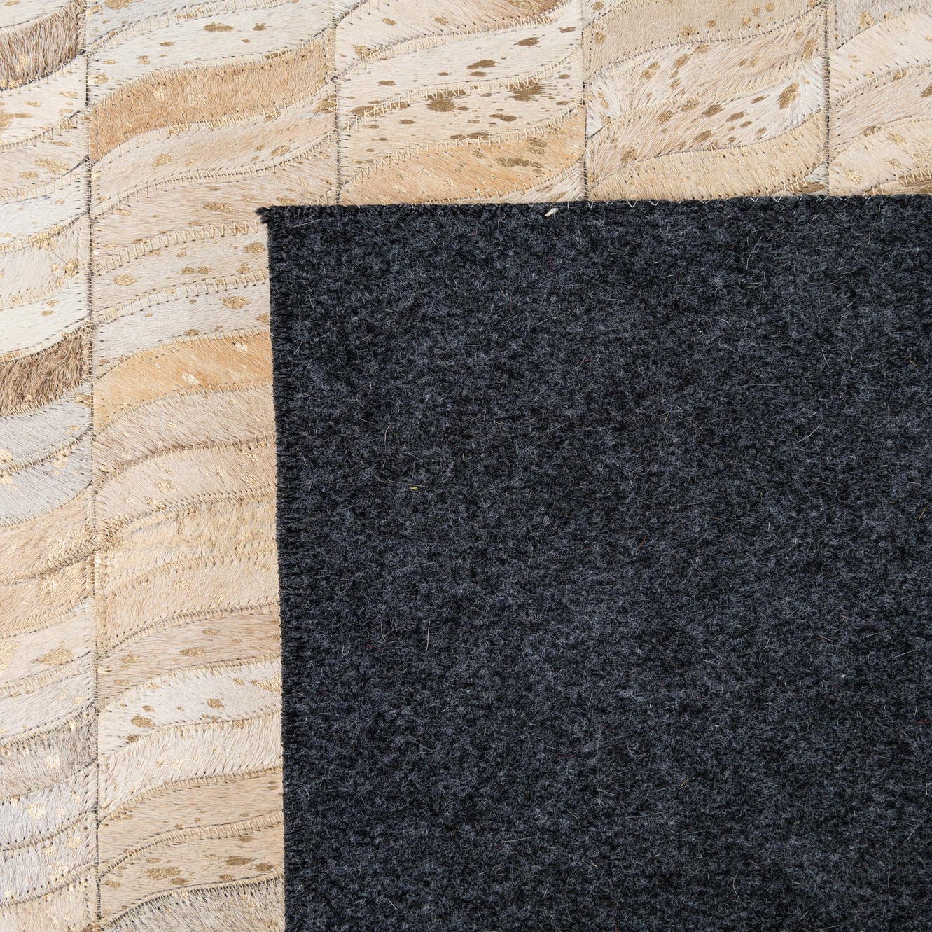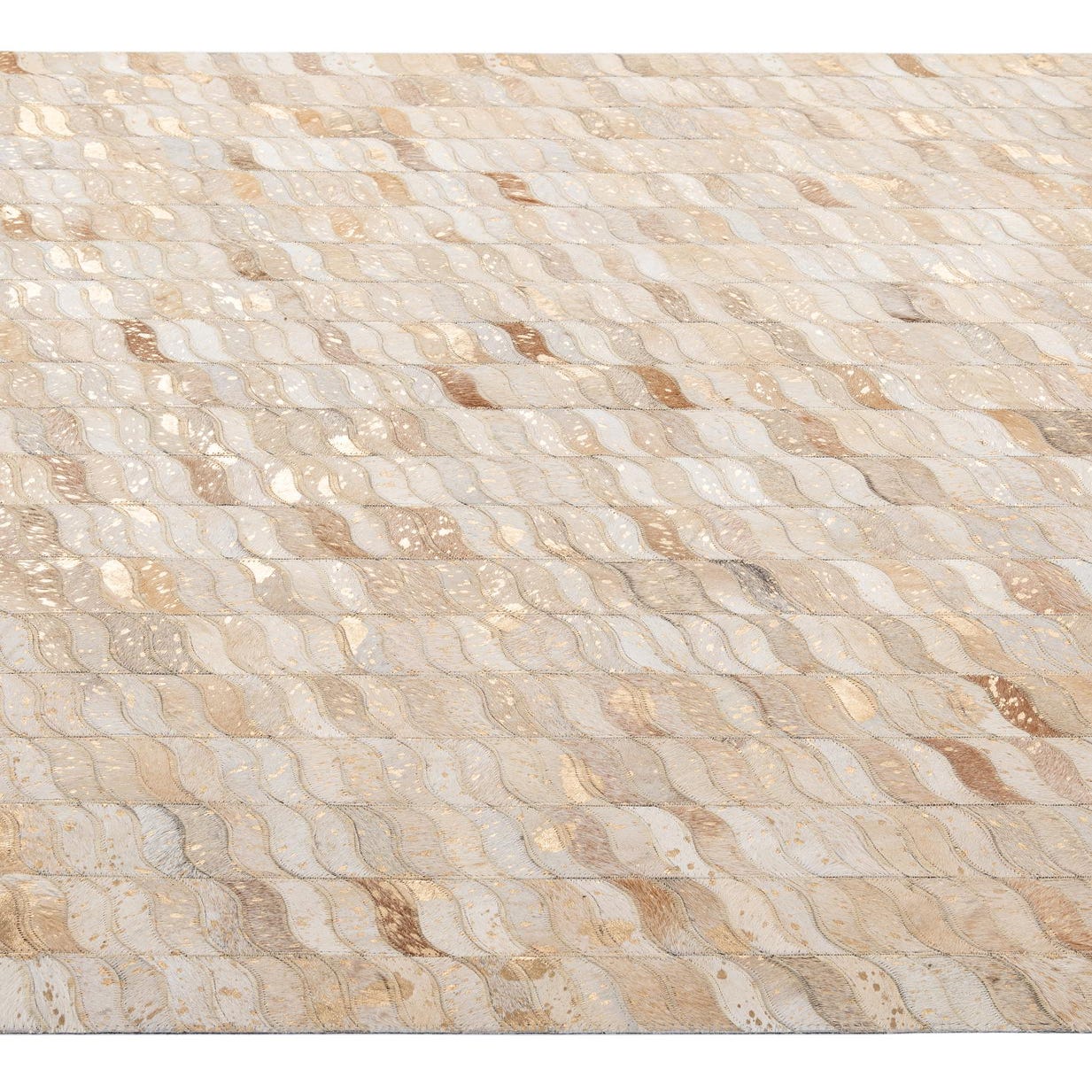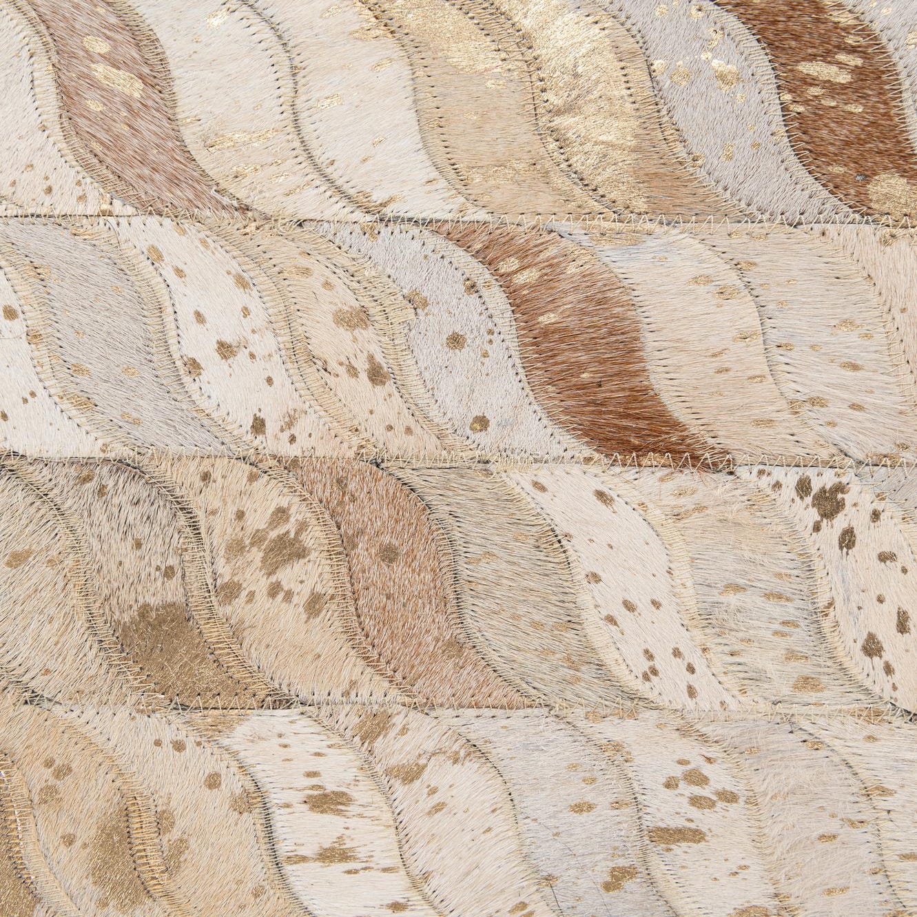 Hand made of cowhide and leather, this rug presents a subtle patchwork of narrow panels arranged in a flowing, wave-like motif across a cream field. The palette blends cream, ivory, beige, light brown and hints of gold, with each panel showing natural markings and grain that create gentle contrast and visual texture. The surface has the characteristic low-profile, hair-on-hide feel — smooth to the touch with a soft nap and a slight leather sheen where pieces join.