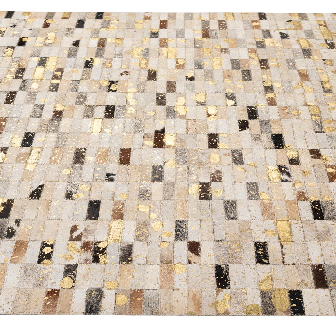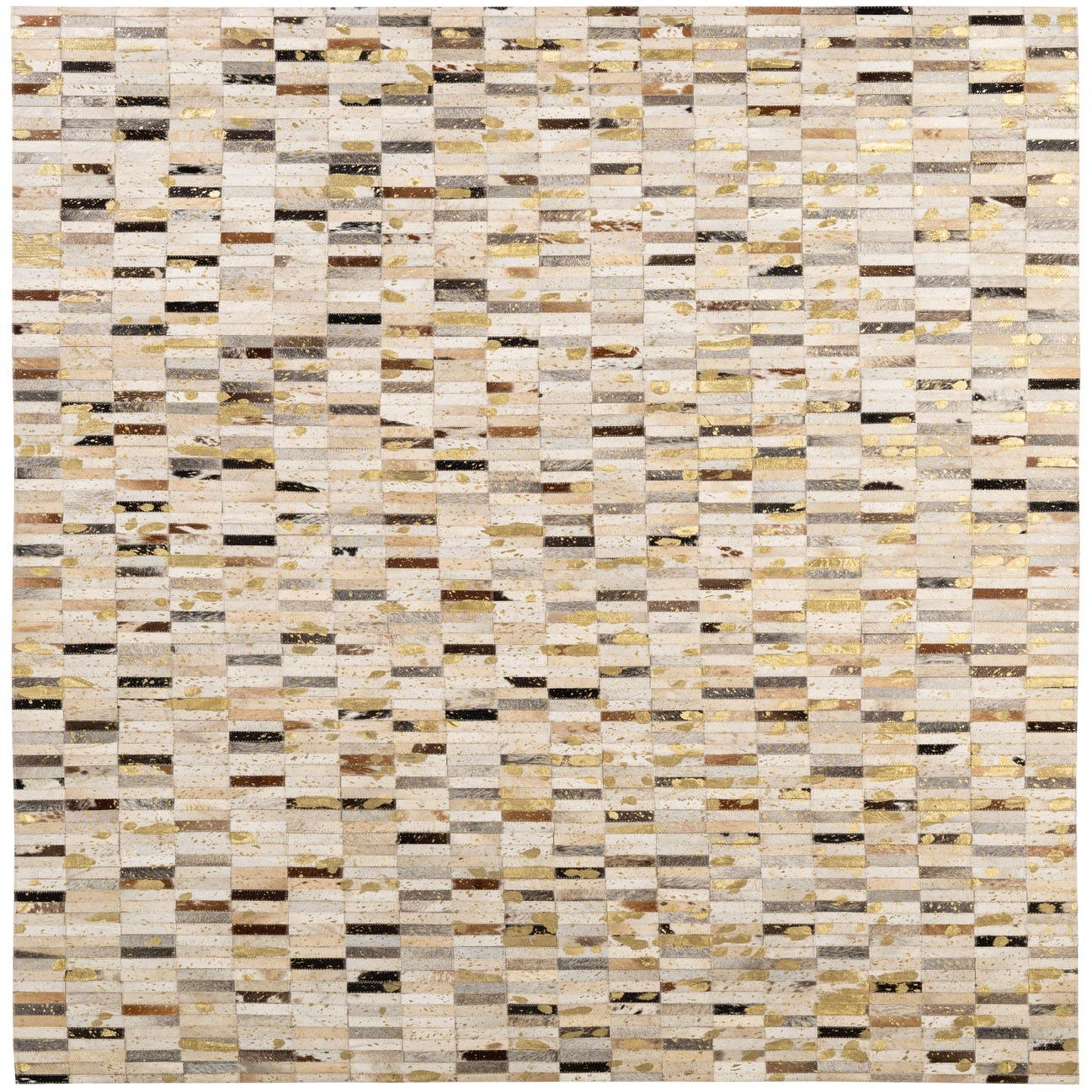 Hand made of cowhide and leather, this patchwork rug arranges narrow rectangular tiles into a tight, mosaic-like grid laid over a cream ground. Warm browns, cool grays, ivory and black weave through the composition while scattered gold accents pick up light for subtle highlights. The hair-on-hide surface has a low, tactile nap and stitched seams that give a gentle, hand-assembled texture you can feel underfoot.