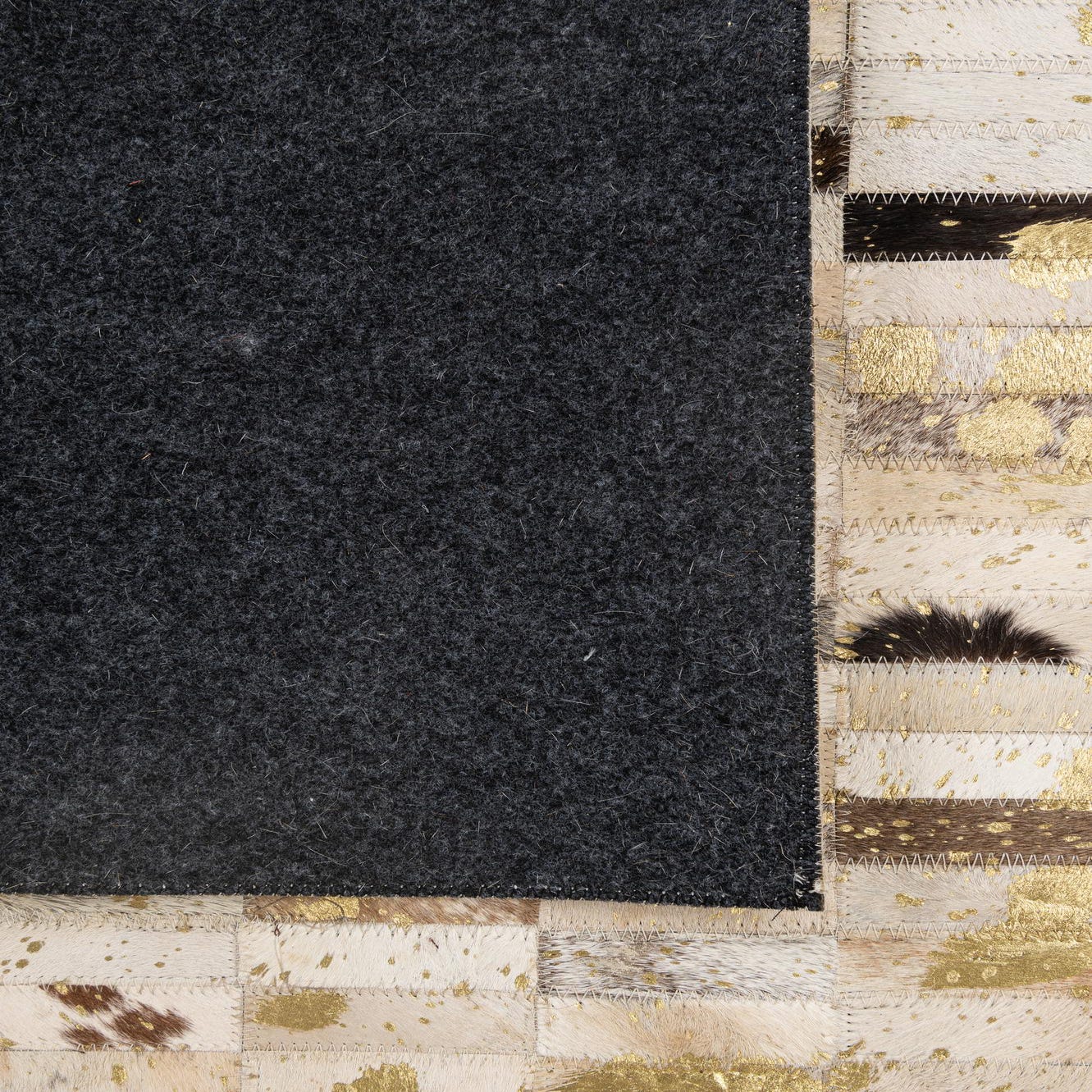 A rectangular 5x8 modern patchwork cowhide rug with ivory, cream, brown, black, and metallic gold rectangular patches.