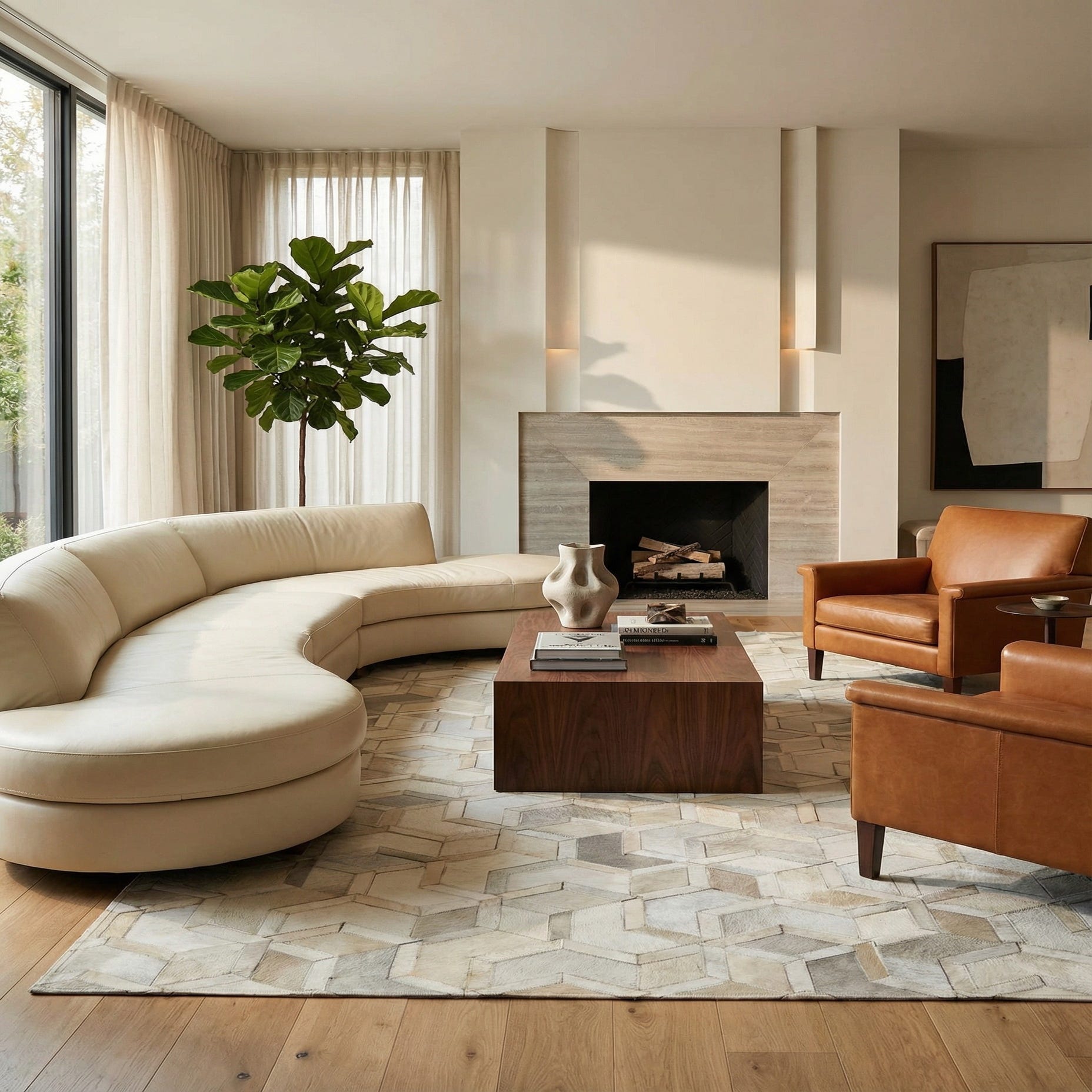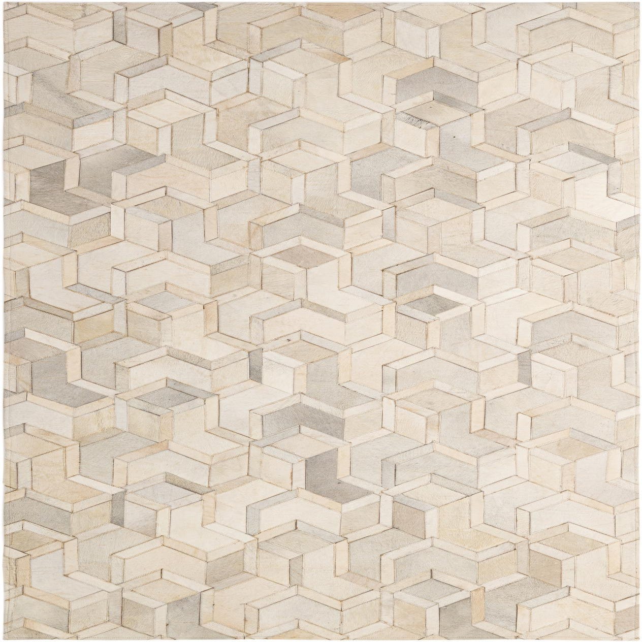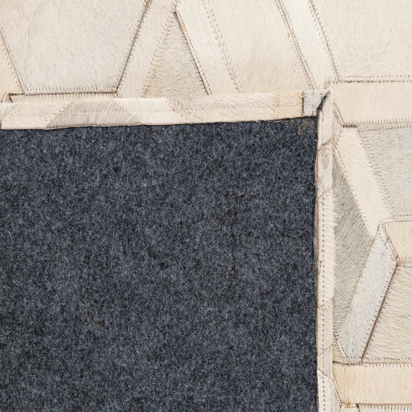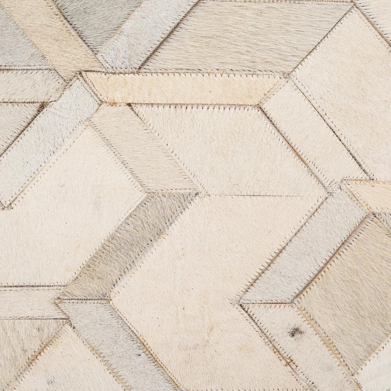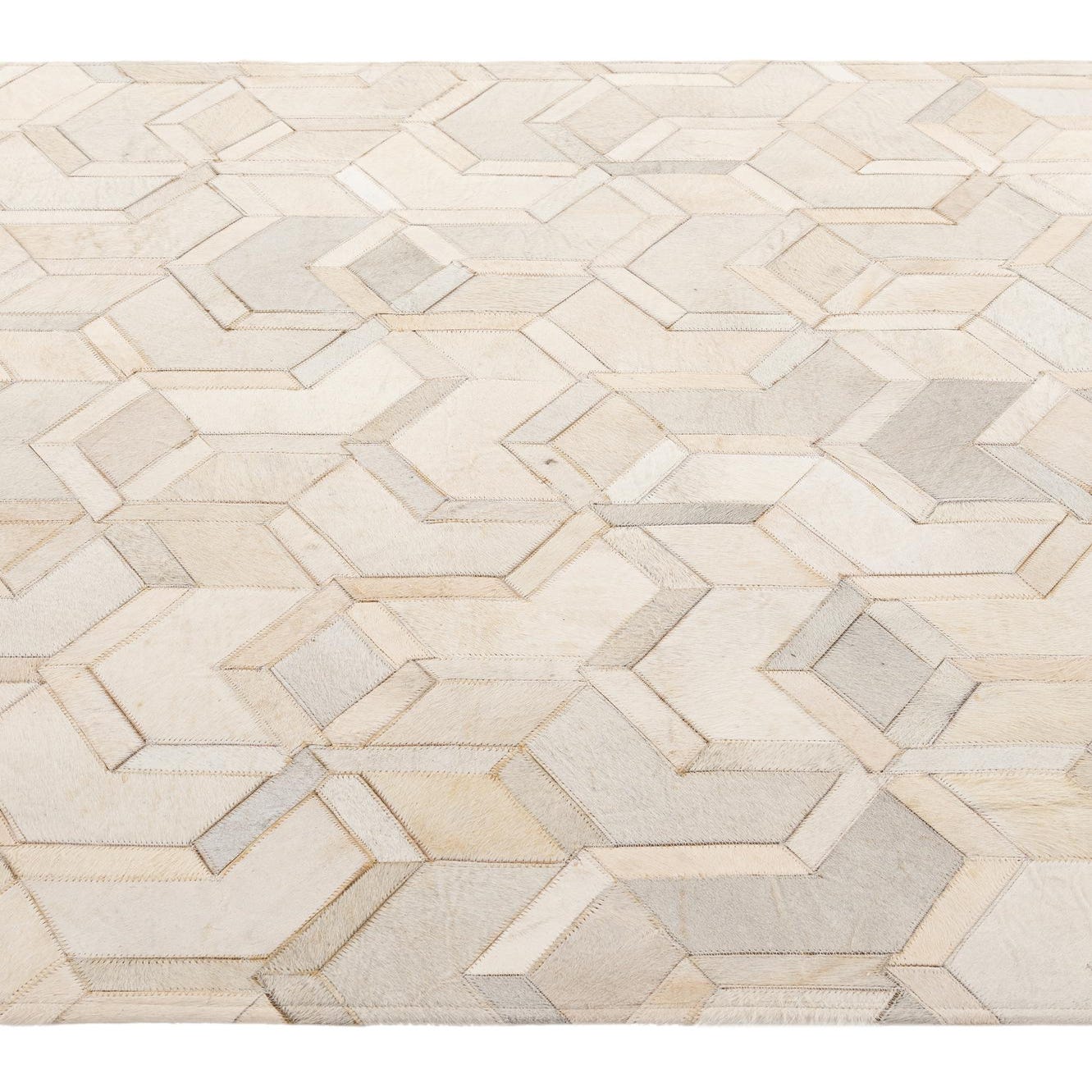 A 5x8 rectangular Cowhide - Patchwork rug featuring a modern geometric pattern in ivories and creams, perfect for a living room.