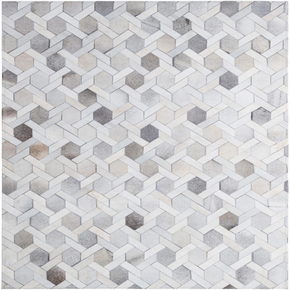 A 5x8 rectangular Cowhide Patchwork rug featuring a modern geometric pattern in various shades of ivory, cream, and light gray.