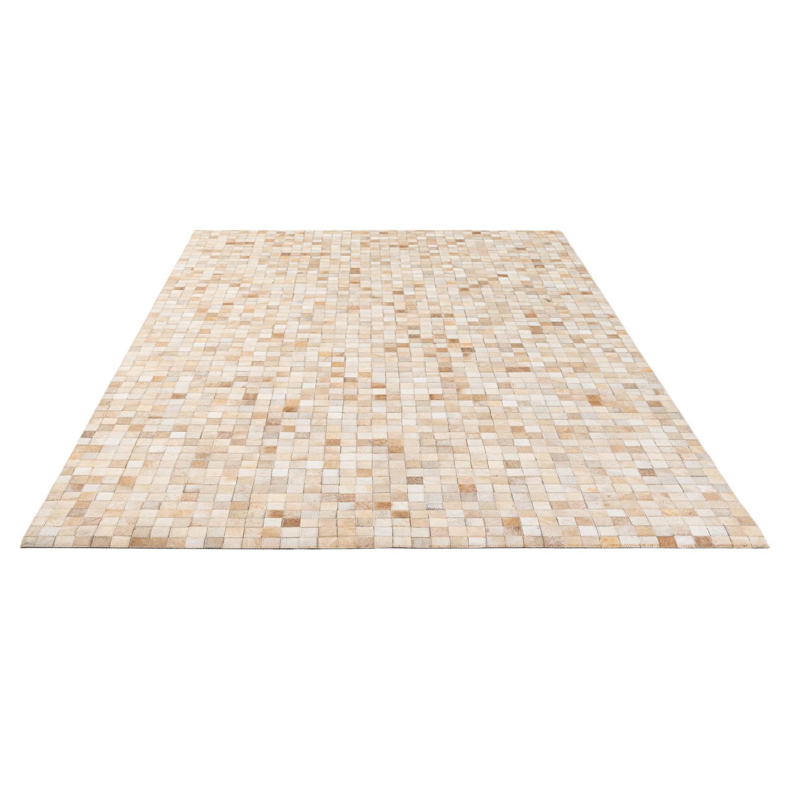 Handmade from cowhide with leather-stitched seams, this patchwork rug arranges small square panels into a tight, mosaic-like field set on a cream ground. The palette blends cream, beige, light brown, and tan for a quietly warm, tonal look. The hair-on-hide surface has a soft, tactile feel and a subtle natural sheen, while the visible stitch lines add a refined, textural grid that reads as both crafted and contemporary.