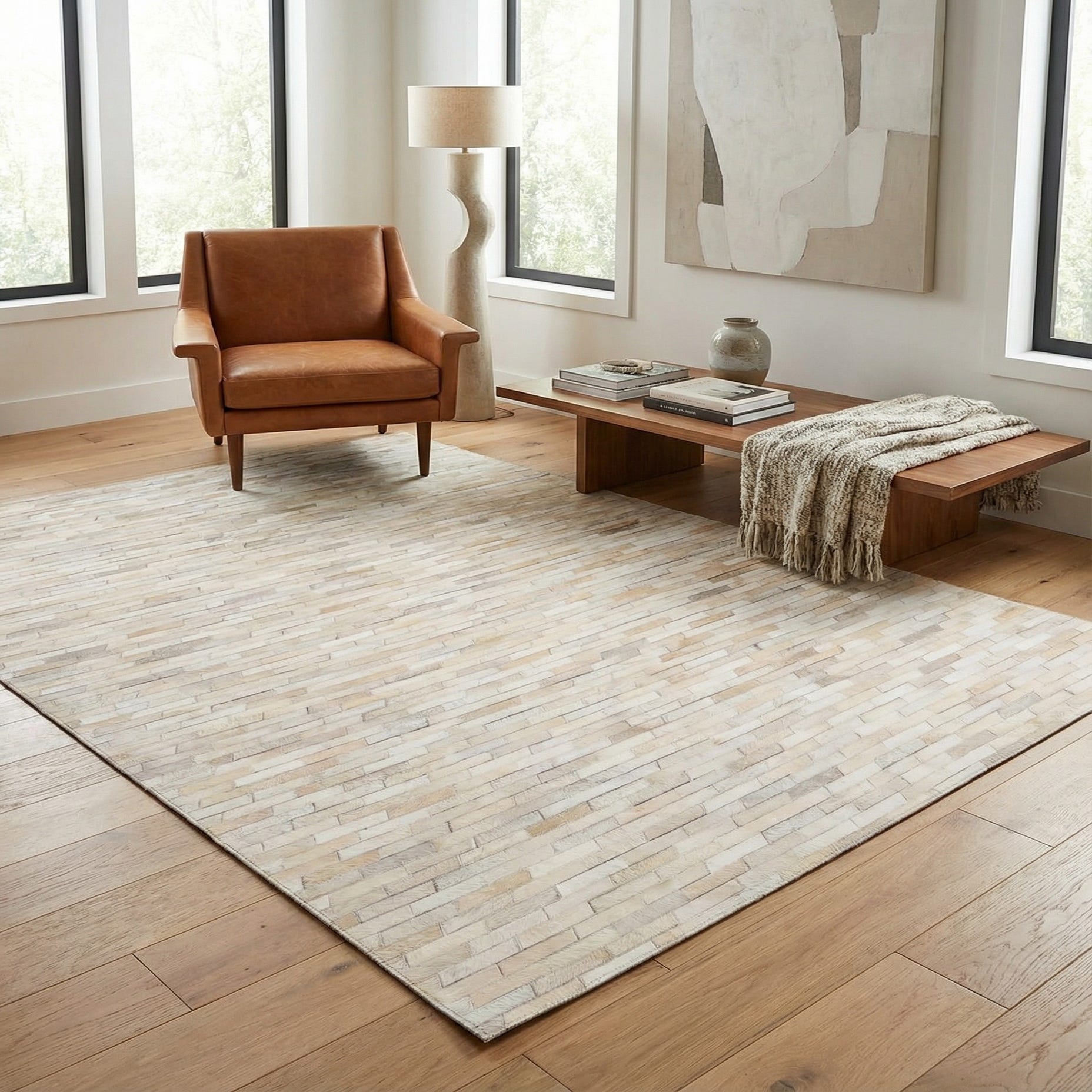 A 5x8 rectangular ivory and cream modern cowhide rug with a flat pile, featuring a subtle geometric pattern of varied light-toned leather pieces.