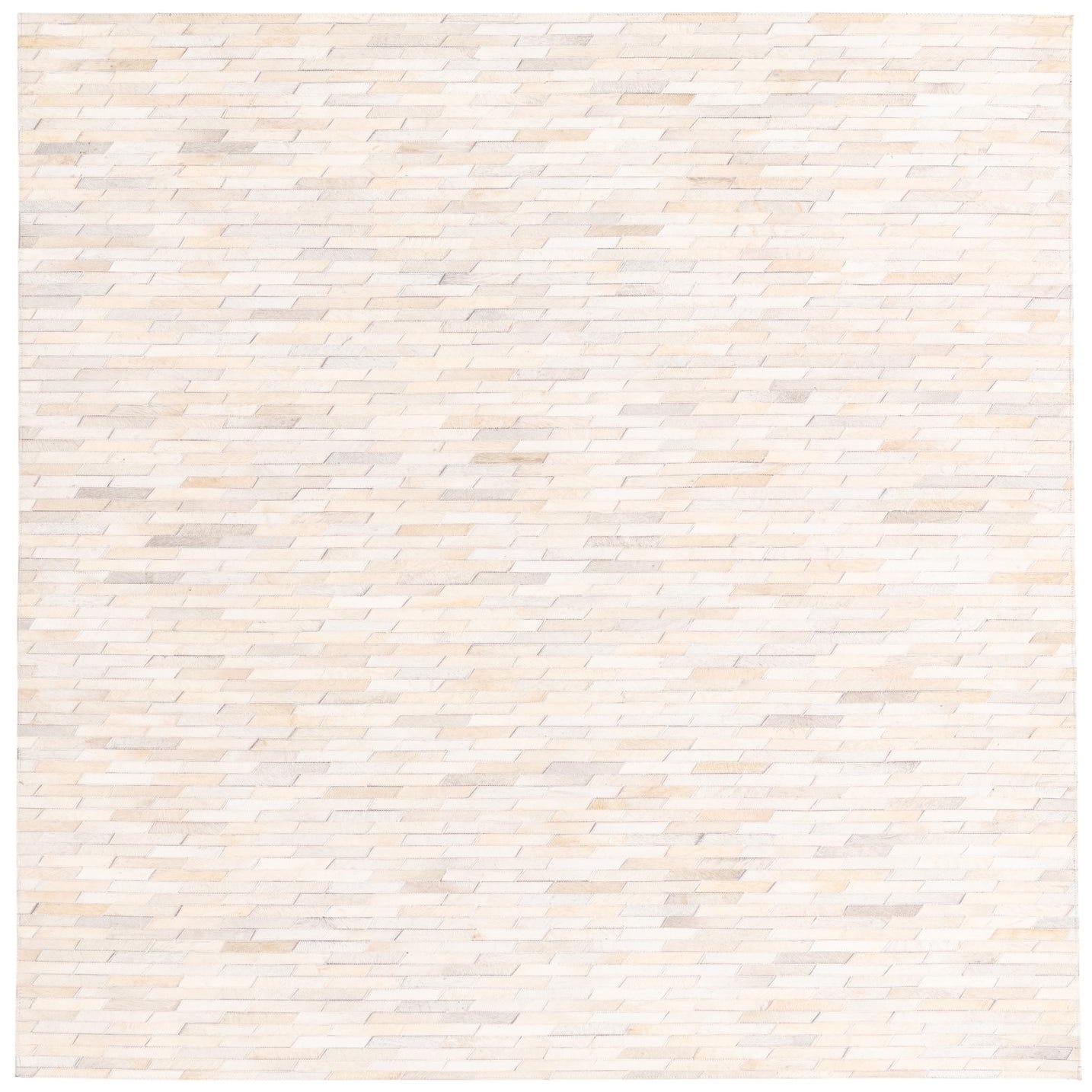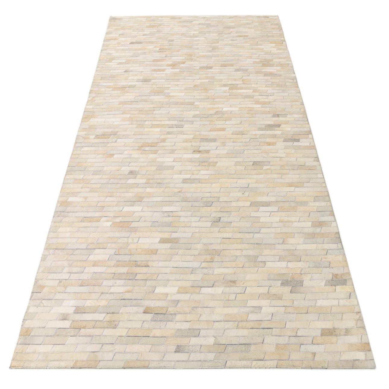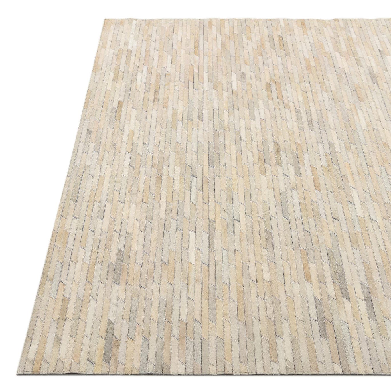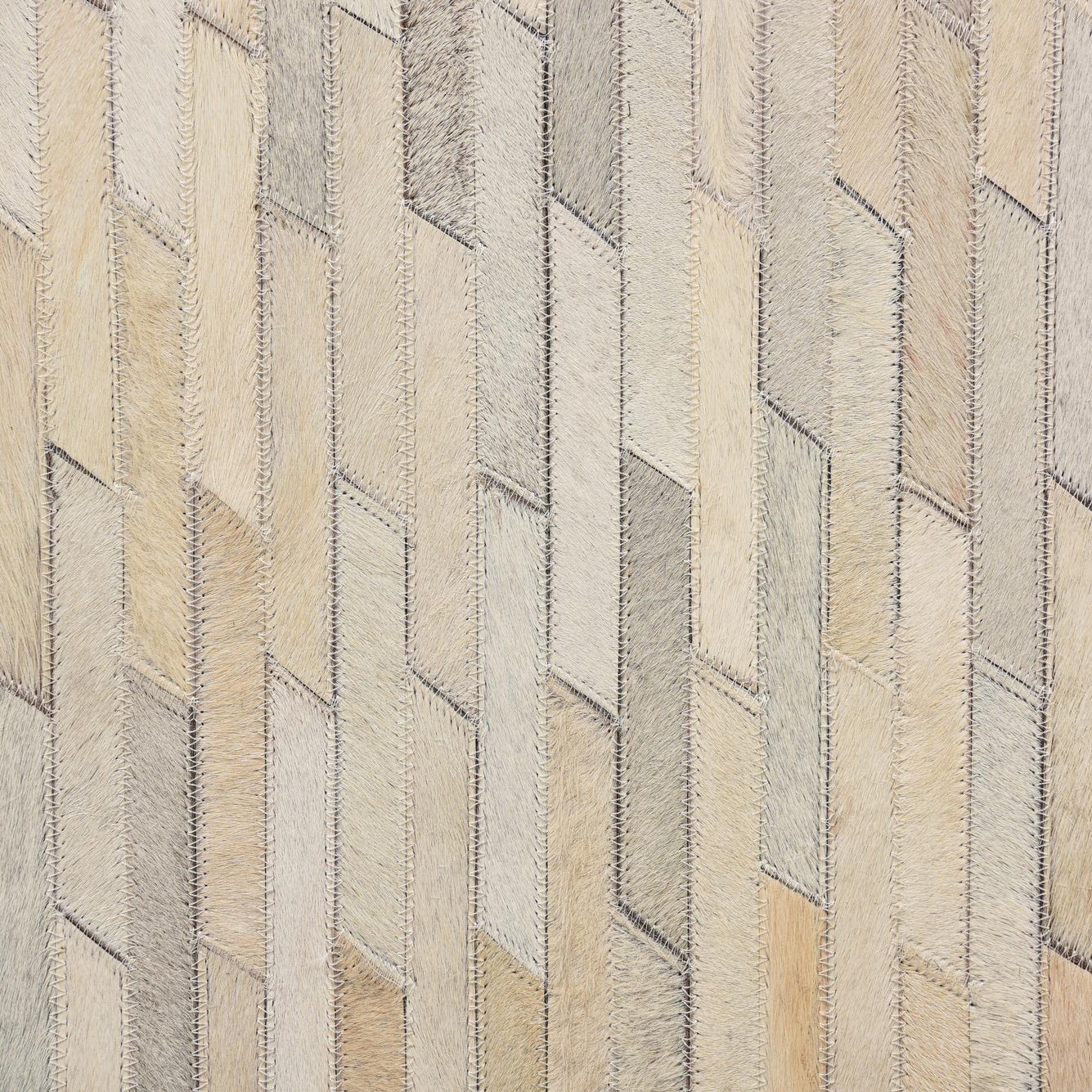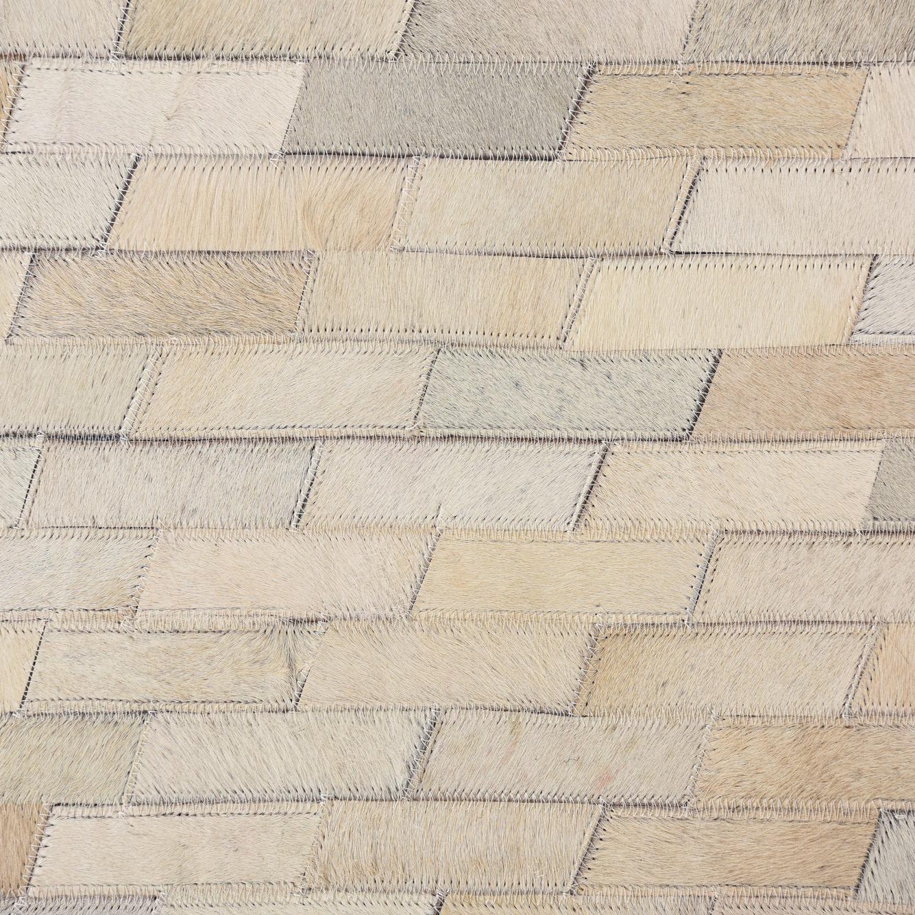 The Cowhide Collection offers this handcrafted 5x8 rug, composed of genuine cowhide and leather. It showcases a harmonious blend of cream, ivory, and gray hues set against a cream background, resulting in a sophisticated neutral palette. The rug's pattern gives the impression of a textured brick layer with varying shades that add depth and character to the piece. The natural texture of the cowhide and leather delivers a tactile experience underfoot.