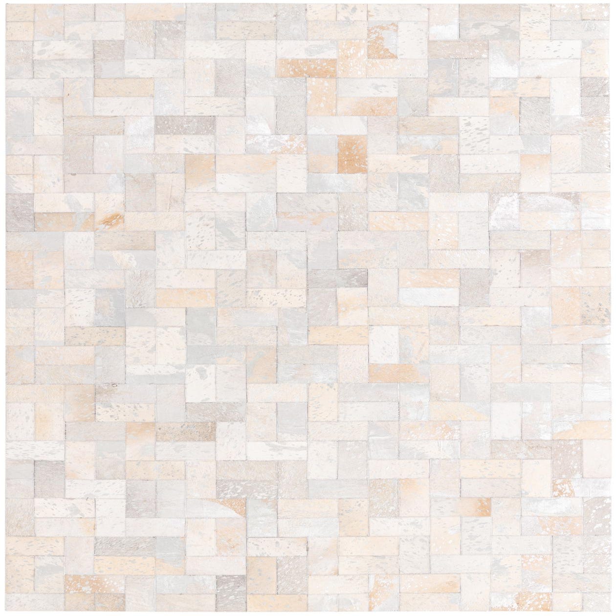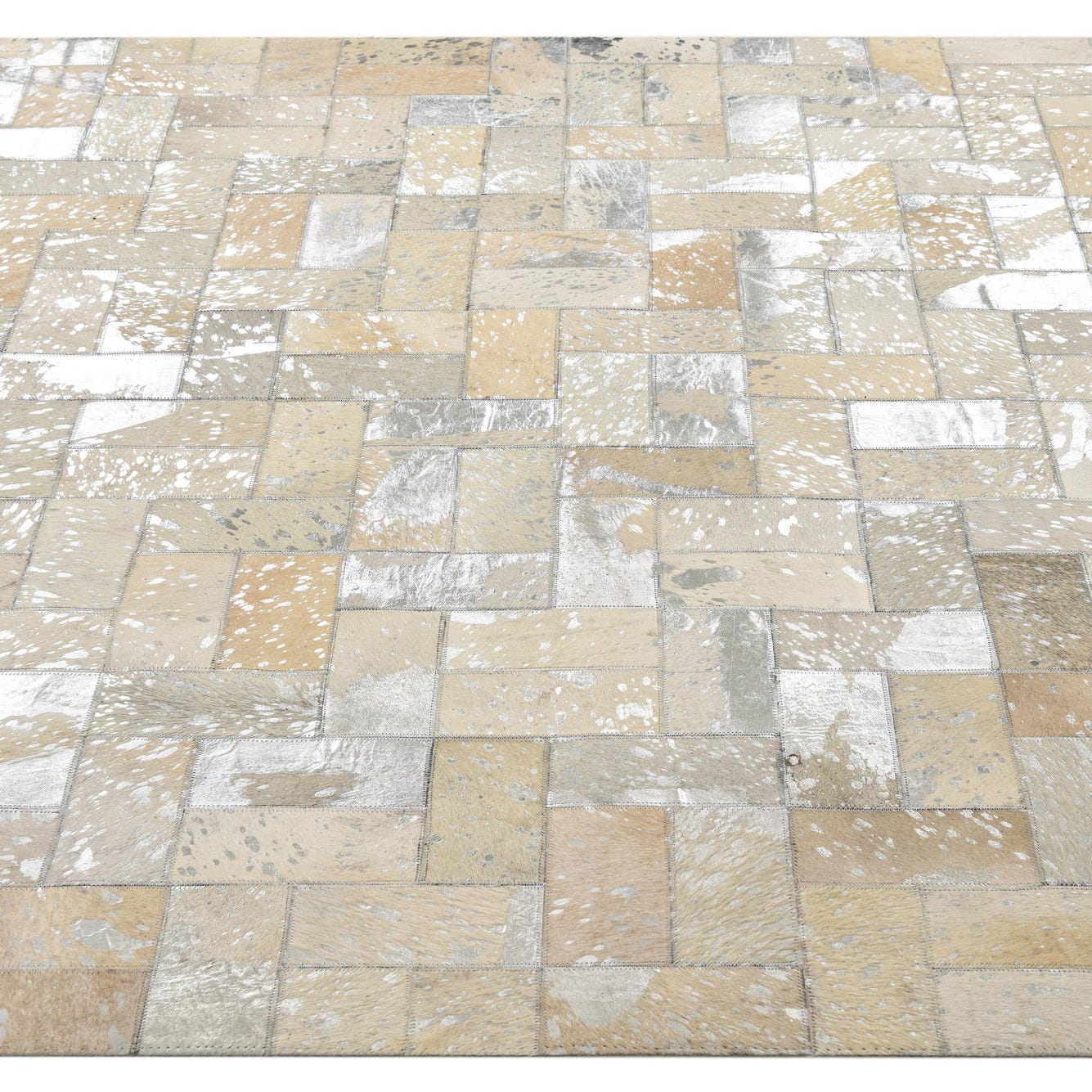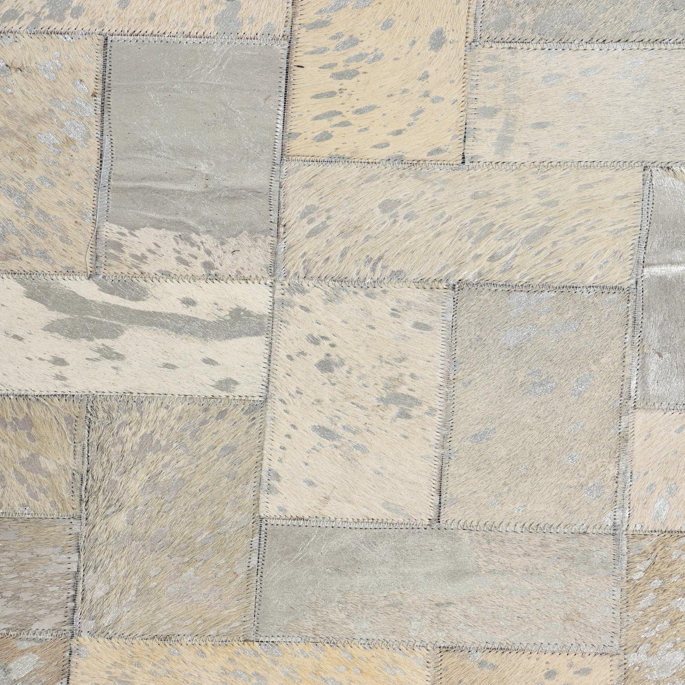This Cowhide collection rug presents a harmonious blend of cream, beige, and silver hues, set upon a cream background that provides a versatile canvas for various design schemes. The handcrafted mosaic of cowhide and leather pieces in varied shades and textures delivers a unique tactile experience and visual depth. Each segment is carefully positioned to create an intriguing, geometric pattern that effortlessly elevates any space.