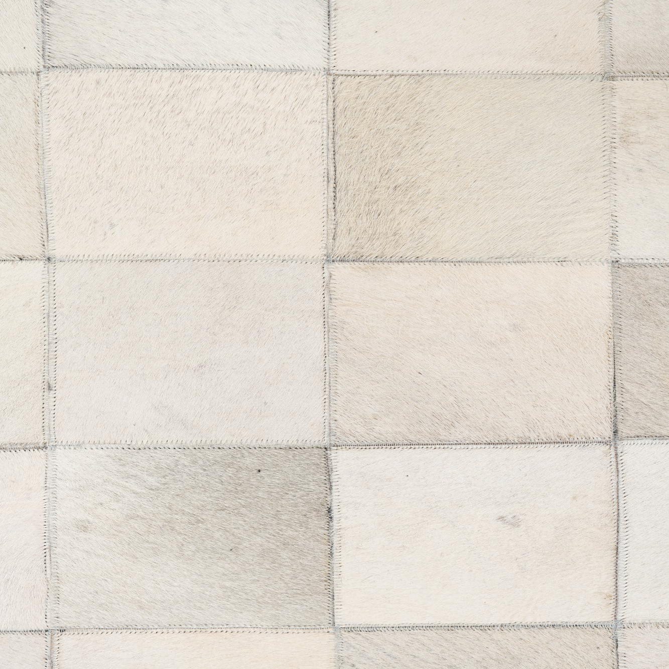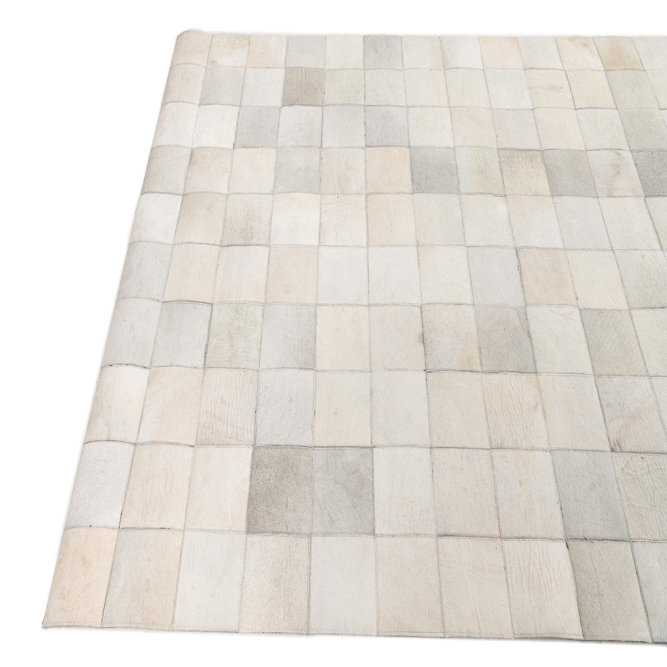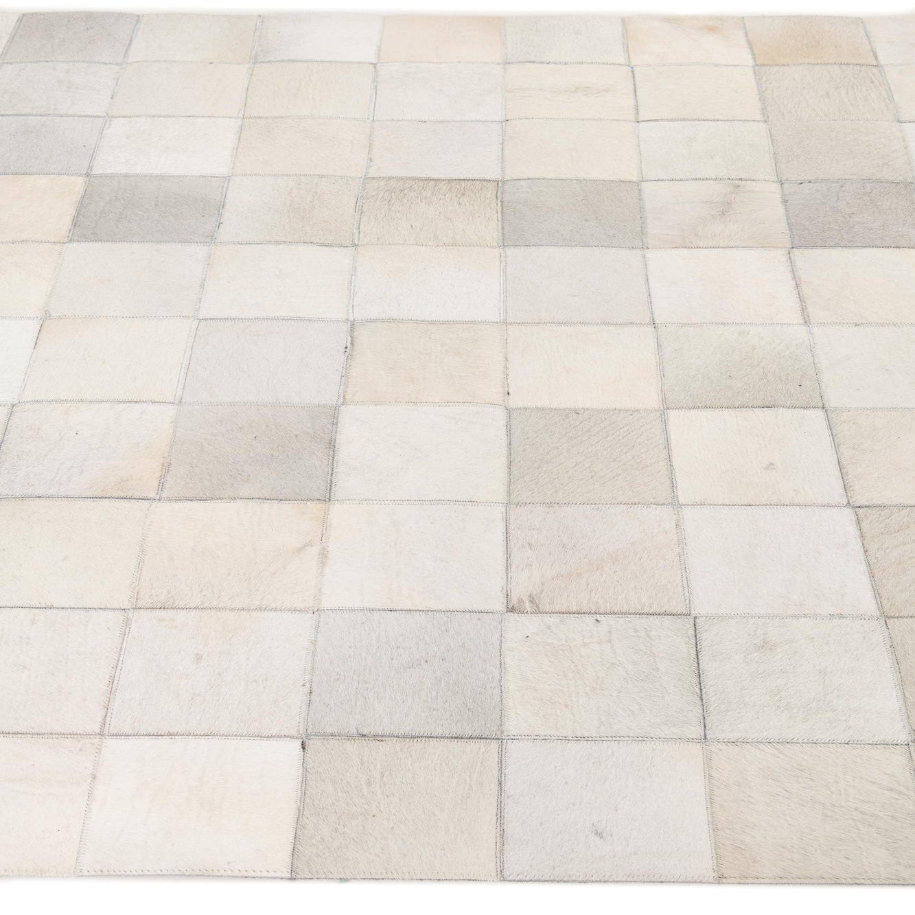The Cowhide Leather Collection presents this handcrafted 5x8 rug, meticulously made of cowhide and leather. Displaying a subtle yet engaging checkerboard pattern, the rug harmonizes cream, ivory, and gray hues on a cream backdrop to create a soft, neutral color scheme. The natural variance in the hide's shades and textures adds depth and individual character to each piece, while the material selection brings a tactile richness to the rug's surface.