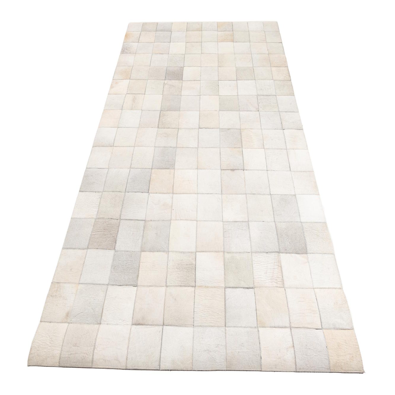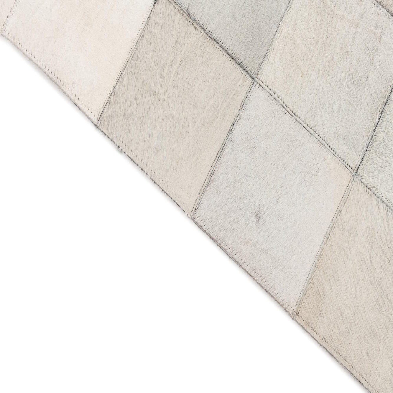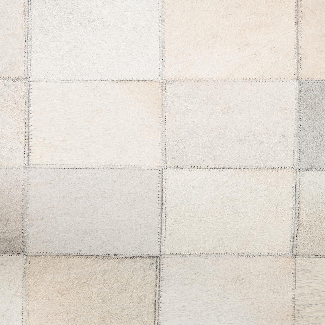 The Cowhide Leather Collection presents this handcrafted 5x8 rug, meticulously made of cowhide and leather. Displaying a subtle yet engaging checkerboard pattern, the rug harmonizes cream, ivory, and gray hues on a cream backdrop to create a soft, neutral color scheme. The natural variance in the hide's shades and textures adds depth and individual character to each piece, while the material selection brings a tactile richness to the rug's surface.
