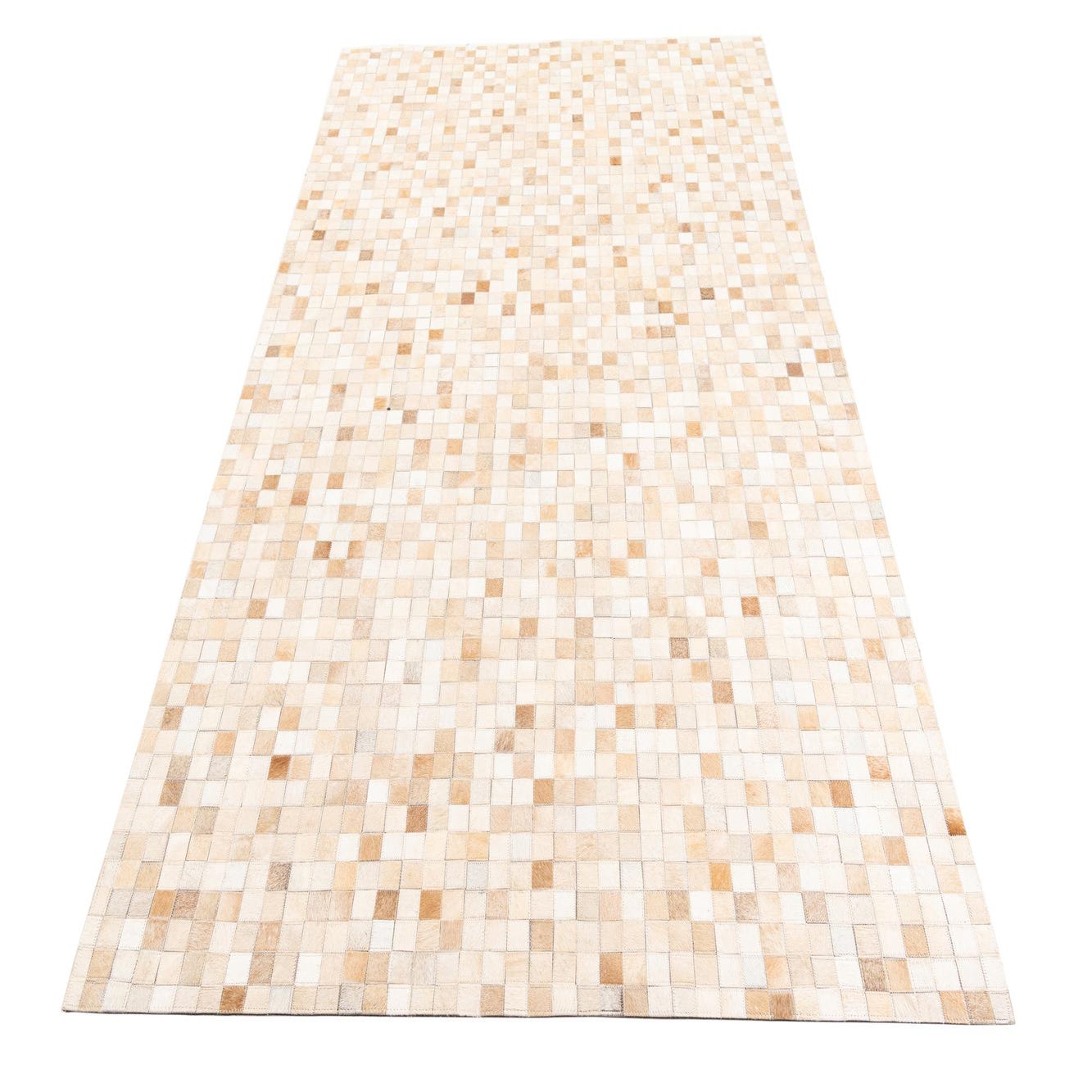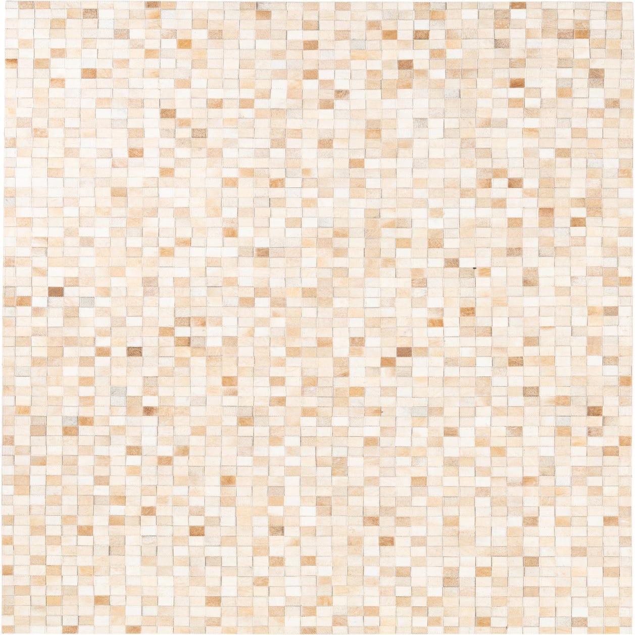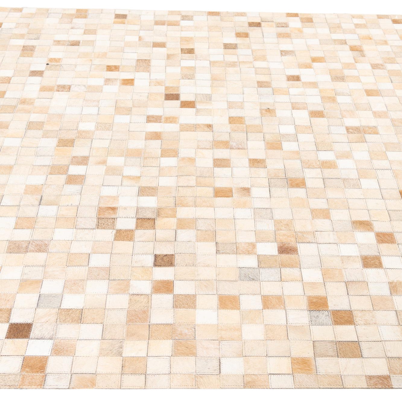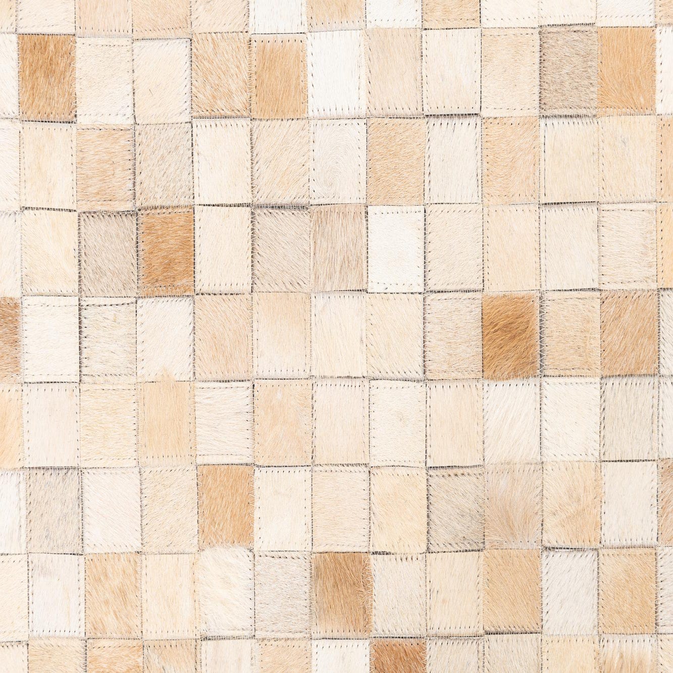 A 5x8 rectangular Cowhide Leather rug featuring a modern, abstract pattern of small ivory and cream square patches.