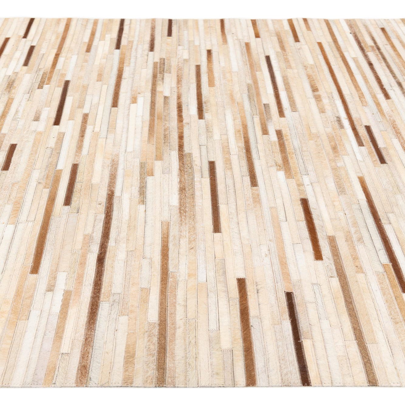 A 5x8 rectangular Cowhide Stocks rug in ivory and cream with a modern stripe pattern, suitable for a living room.