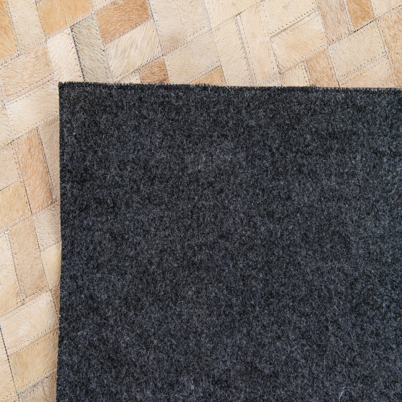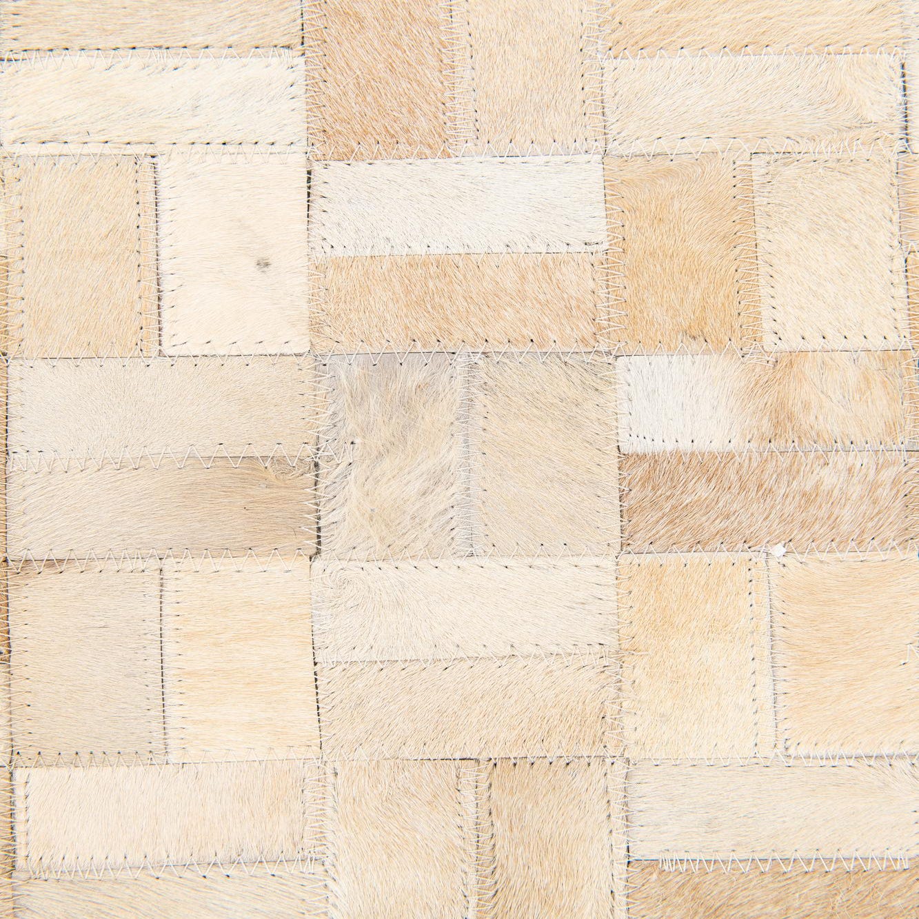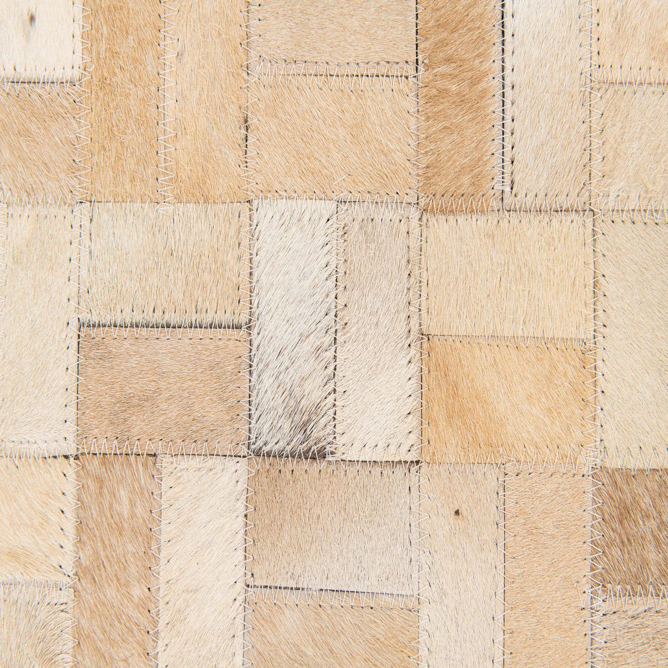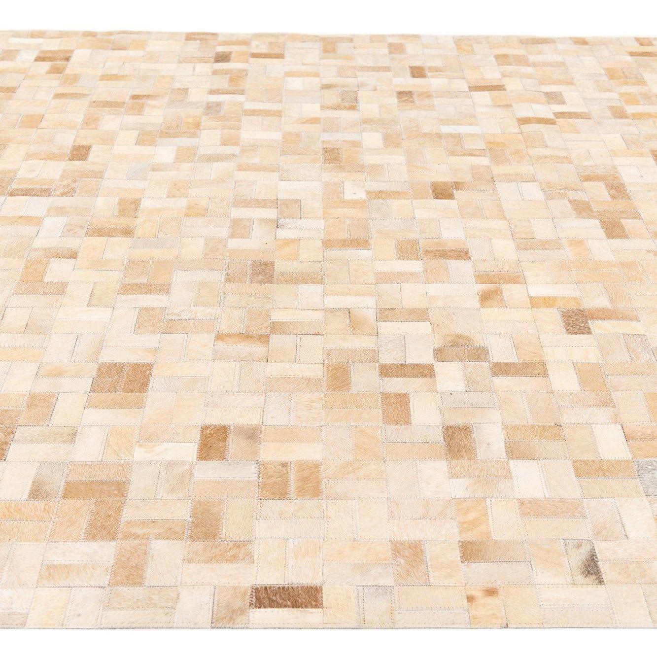 A stitched patchwork of small rectangular tiles creates a subtle mosaic across a cream field, where shades of ivory, tan and brown form a calm, layered composition. Hand made from cowhide and leather, the surface has a soft hair-on-hide feel with a low profile and a gentle, natural sheen. Visible stitching and slight tonal variations in each piece give the rug a tactile quality—smooth to the touch with discreet seams that add depth and visual interest.