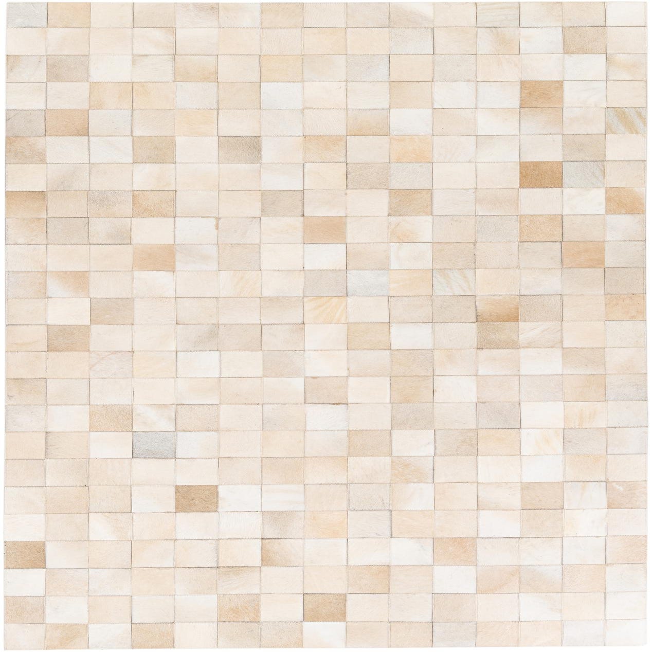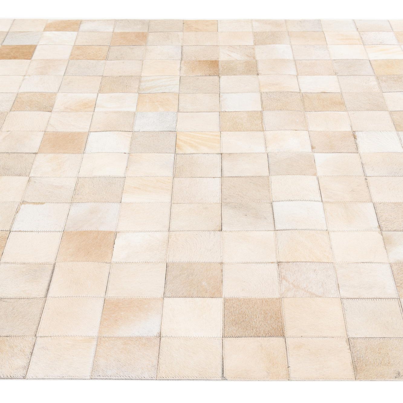 A 5x8 rectangular Cowhide Stocks rug from Rugs.com, featuring a modern patchwork of ivory and cream cowhide squares.